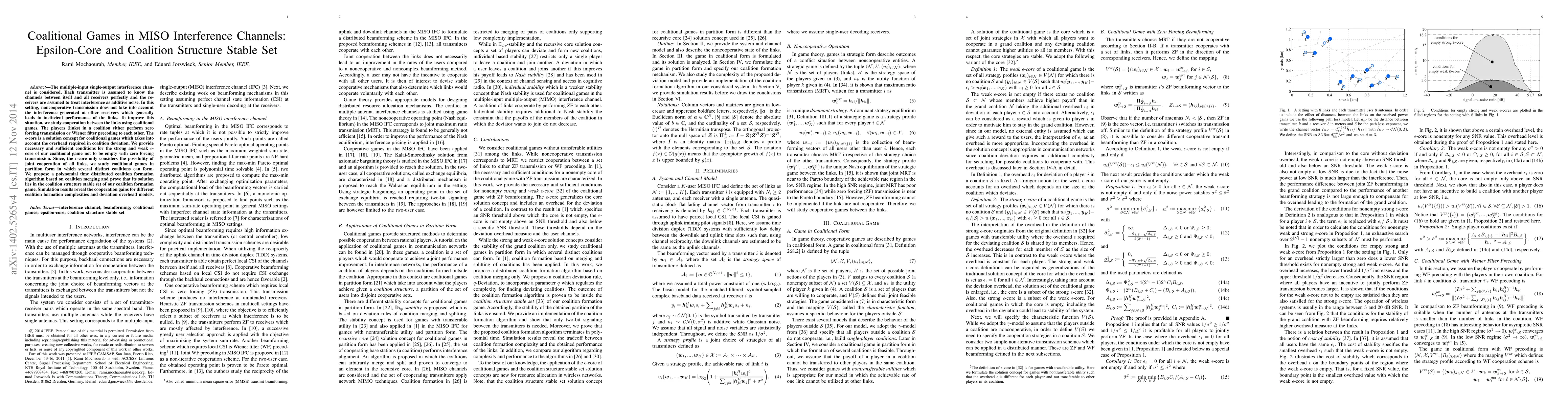 This paper explores cooperation in MISO interference channels using coalitional games to improve link performance. It introduces the $\epsilon$-core for analyzing coalitional deviations and proposes a polynomial time algorithm for distributed coalition formation, ensuring solutions lie within the coalition structure stable set.