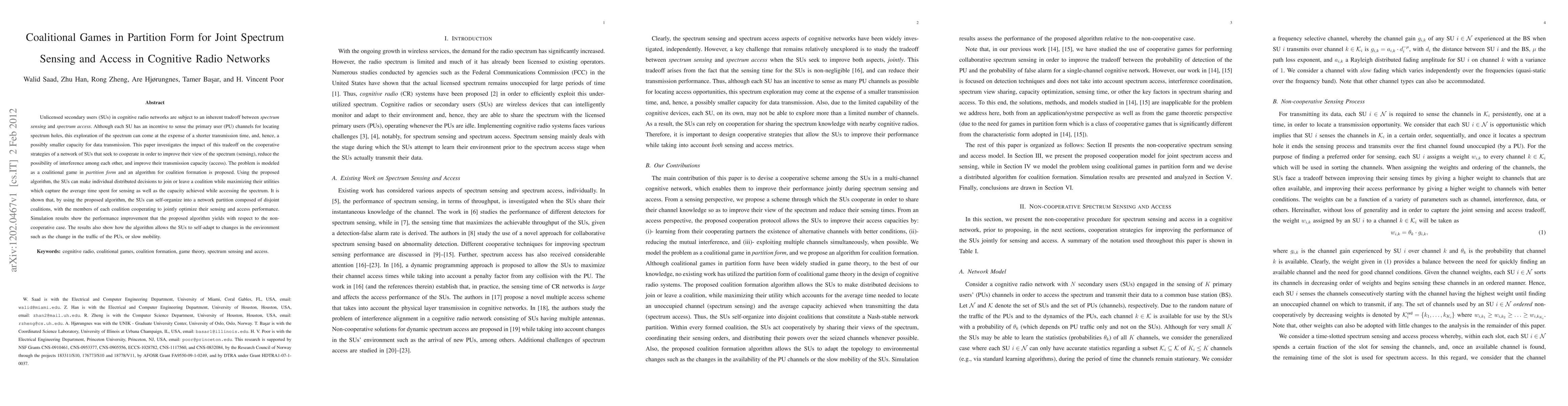 This paper models the joint spectrum sensing and access problem in cognitive radio networks as a coalitional game in partition form, proposing an algorithm for coalition formation that allows unlicensed secondary users to self-organize into disjoint coalitions to optimize their sensing and transmission capacity. Simulation results demonstrate performance improvements and adaptability to environmental changes.