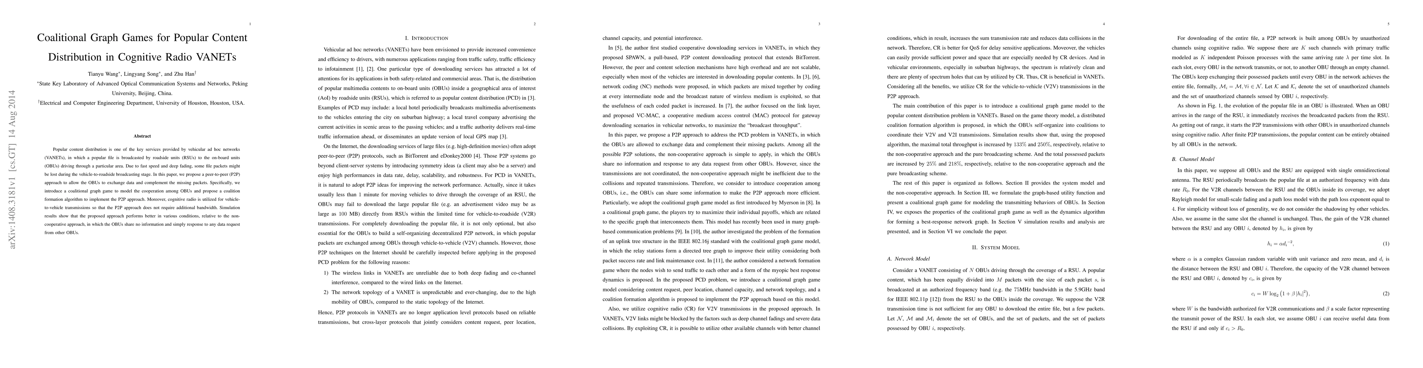 This paper proposes a peer-to-peer (P2P) approach for popular content distribution in vehicular ad hoc networks (VANETs) using coalitional graph games to model cooperation among on-board units (OBUs) for exchanging data to compensate for lost packets. Cognitive radio is employed for vehicle-to-vehicle transmissions without requiring additional bandwidth.