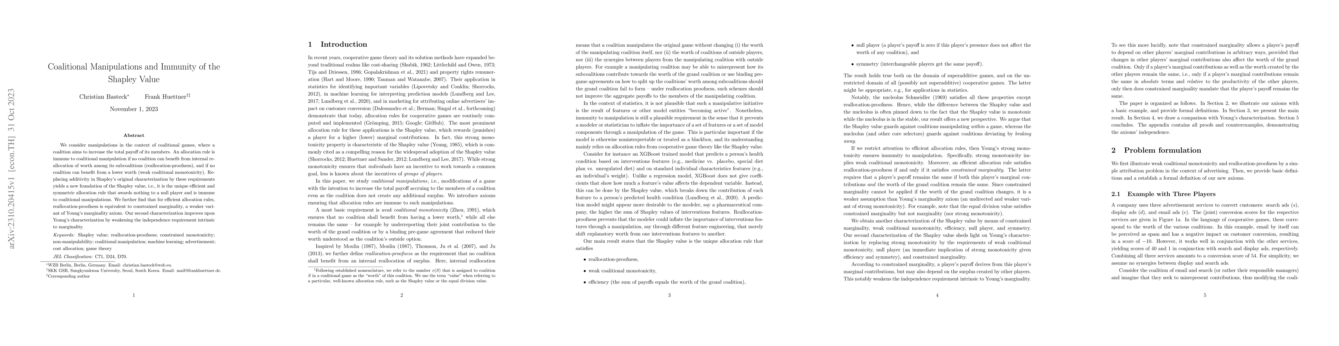 This paper explores coalitional manipulations in coalitional games, proposing that a Shapley value is immune to such manipulations if it satisfies reallocation-proofness and weak coalitional monotonicity. It finds that reallocation-proofness is equivalent to constrained marginality, offering a refined characterization of the Shapley value.
