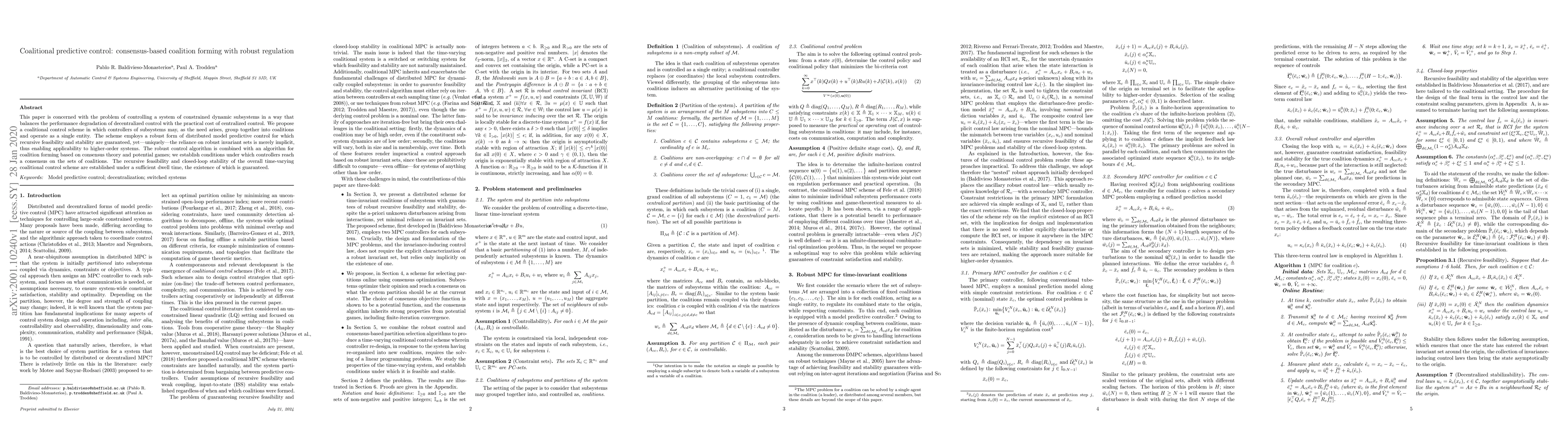 Researchers propose a coalitional control scheme that allows decentralized controllers to form coalitions and operate as a single entity for better system performance, using robust distributed model predictive control with guaranteed recursive feasibility and stability.