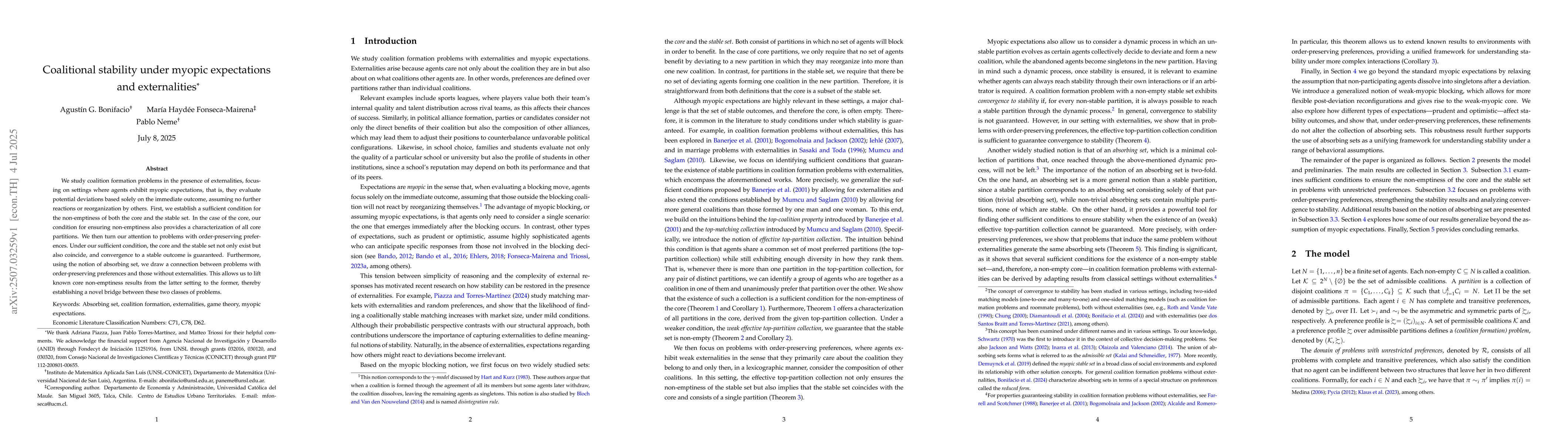 We study coalition formation problems in the presence of externalities, focusing on settings where agents exhibit myopic expectations, that is, they evaluate potential deviations based solely on the immediate outcome, assuming no further reactions or reorganization by others. First, we establish a sufficient condition for the non-emptiness of both the core and the stable set. In the case of the core, our condition for ensuring non-emptiness also provides a characterization of all core partitions. We then turn our attention to problems with order-preserving preferences. Under our sufficient condition, the core and the stable set not only exist but also coincide, and convergence to a stable outcome is guaranteed. Furthermore, using the notion of absorbing set, we draw a connection between problems with order-preserving preferences and those without externalities. This allows us to lift known core non-emptiness results from the latter setting to the former, thereby establishing a novel bridge between these two classes of problems.