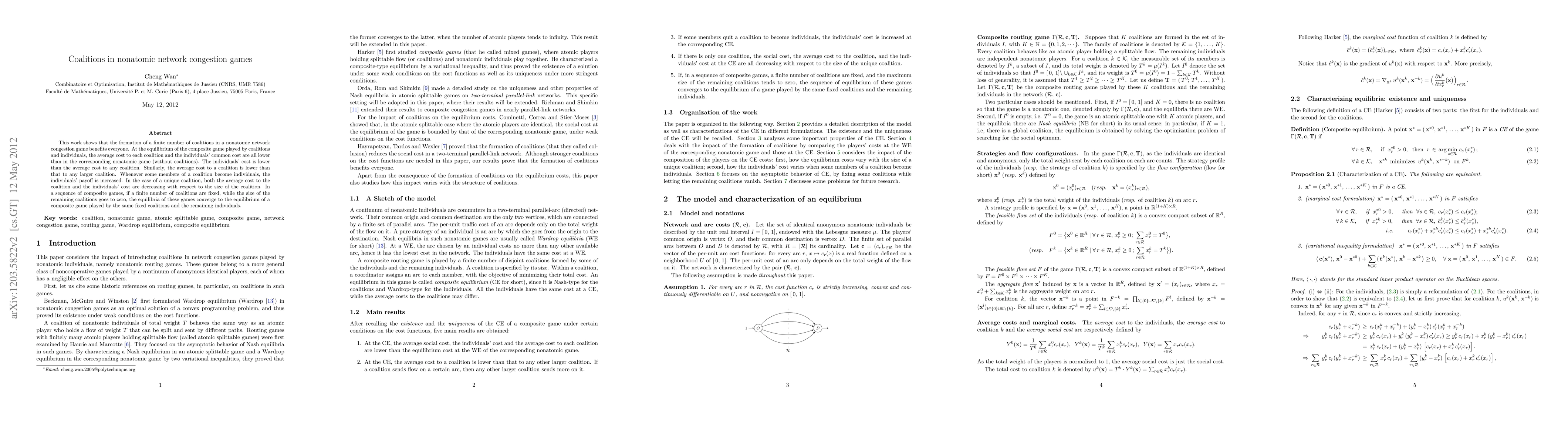 This work shows that the formation of a finite number of coalitions in a nonatomic network congestion game benefits everyone. At the equilibrium of the composite game played by coalitions and individuals, the average cost to each coalition and the individuals' common cost are all lower than in the corresponding nonatomic game (without coalitions). The individuals' cost is lower than the average cost to any coalition. Similarly, the average cost to a coalition is lower than that to any larger coalition. Whenever some members of a coalition become individuals, the individuals' payoff is increased. In the case of a unique coalition, both the average cost to the coalition and the individuals' cost are decreasing with respect to the size of the coalition. In a sequence of composite games, if a finite number of coalitions are fixed, while the size of the remaining coalitions goes to zero, the equilibria of these games converge to the equilibrium of a composite game played by the same fixed coalitions and the remaining individuals.