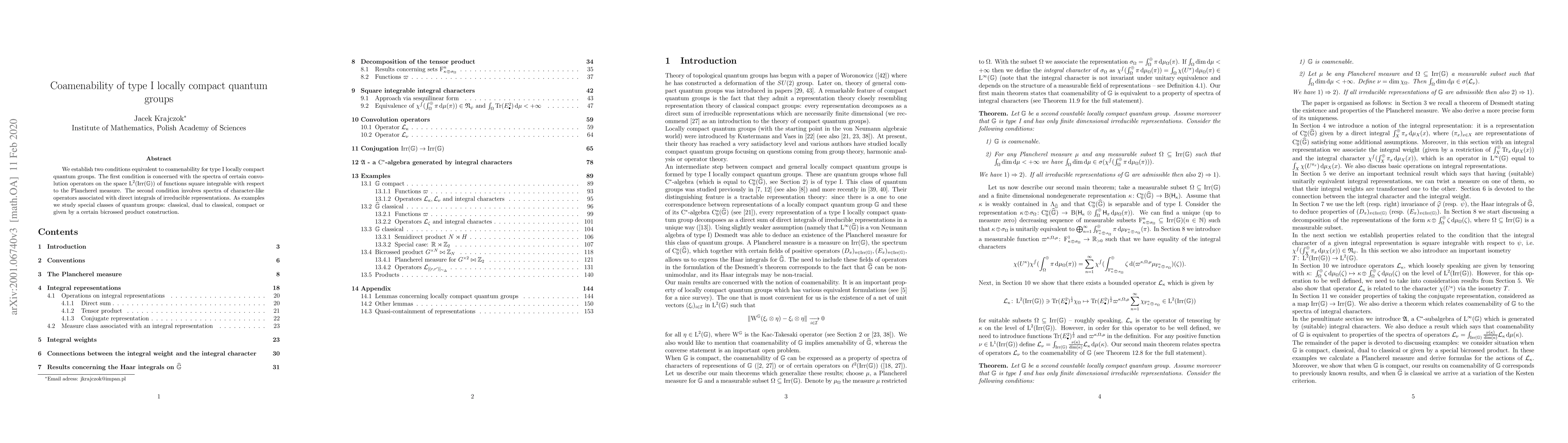 We establish two conditions equivalent to coamenability for type I locally compact quantum groups. The first condition is concerned with the spectra of certain convolution operators on the space $\operatorname{L}^2(\operatorname{Irr}(\mathbb{G}))$ of functions which are square integrable with respect to the Plancherel measure. The second condition involves spectra of character-like operators associated with direct integrals of irreducible representations. As examples we study special classes of quantum groups: classical, dual to classical, compact or given by a certain bicrossed product construction.