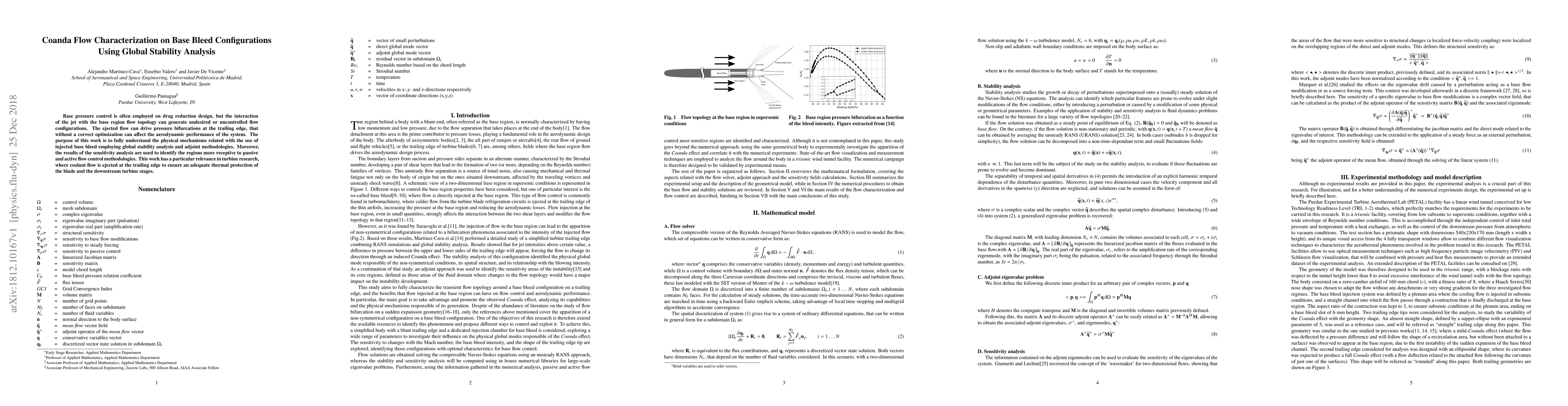 Base pressure control is often employed on drag reduction design, but the interaction of the jet with the base region flow topology can generate undesired or uncontrolled flow configurations. The ejected flow can drive pressure bifurcations at the trailing edge, that without a correct optimization can affect the aerodynamic performance of the system. The purpose of this work is to fully understand the physical mechanisms related with the use of injected base bleed employing global stability analysis and adjoint methodologies. Moreover, the results of the sensitivity analysis are used to identify the regions more receptive to passive and active flow control methodologies. This work has a particular relevance in turbine research, where coolant flow is ejected at the trailing edge to ensure an adequate thermal protection of the blade and the downstream turbine stages.