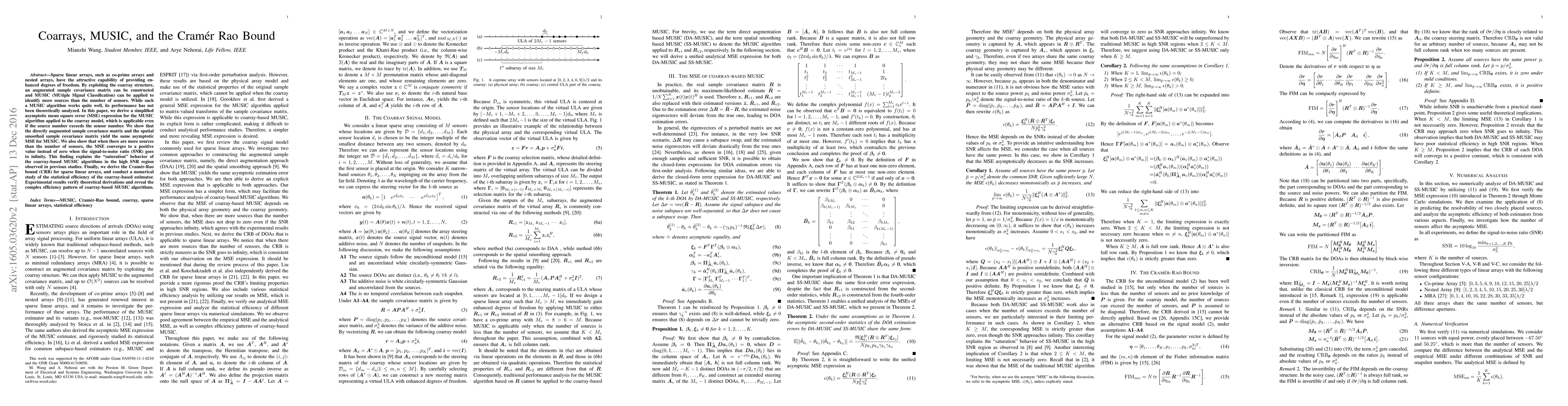 Sparse linear arrays, such as co-prime arrays and nested arrays, have the attractive capability of providing enhanced degrees of freedom. By exploiting the coarray structure, an augmented sample covariance matrix can be constructed and MUSIC (MUtiple SIgnal Classification) can be applied to identify more sources than the number of sensors. While such a MUSIC algorithm works quite well, its performance has not been theoretically analyzed. In this paper, we derive a simplified asymptotic mean square error (MSE) expression for the MUSIC algorithm applied to the coarray model, which is applicable even if the source number exceeds the sensor number. We show that the directly augmented sample covariance matrix and the spatial smoothed sample covariance matrix yield the same asymptotic MSE for MUSIC. We also show that when there are more sources than the number of sensors, the MSE converges to a positive value instead of zero when the signal-to-noise ratio (SNR) goes to infinity. This finding explains the "saturation" behavior of the coarray-based MUSIC algorithms in the high SNR region observed in previous studies. Finally, we derive the Cram\'er-Rao bound (CRB) for sparse linear arrays, and conduct a numerical study of the statistical efficiency of the coarray-based estimator. Experimental results verify theoretical derivations and reveal the complex efficiency pattern of coarray-based MUSIC algorithms.