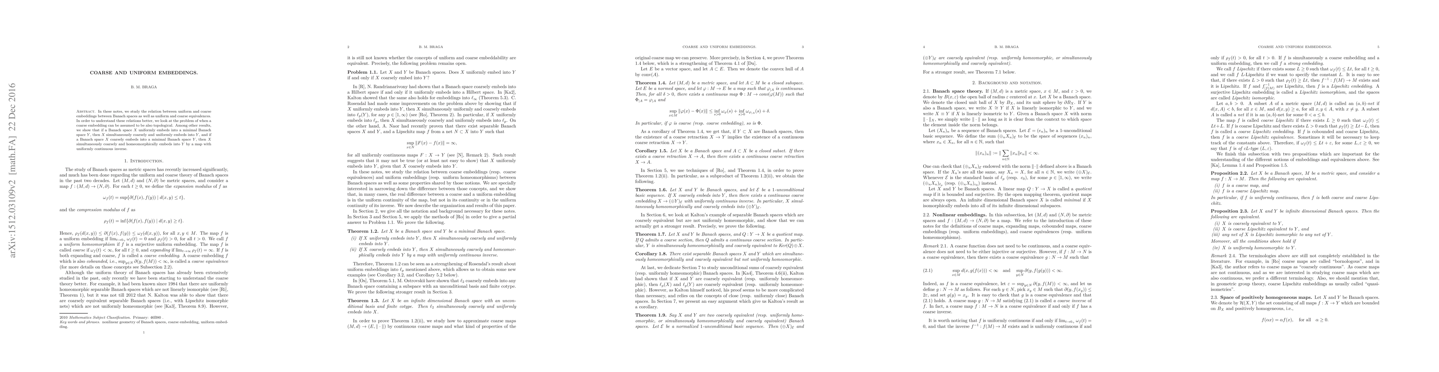 In these notes, we study the relation between uniform and coarse embeddings between Banach spaces. In order to understand this relation better, we also look at the problem of when a coarse embedding can be assumed to be topological. Among other results, we show that if a Banach space $X$ uniformly embeds into a minimal Banach space $Y$, then $X$ simultaneously coarsely and uniformly embeds into $Y$, and if a Banach space $X$ coarsely embeds into a minimal Banach space $Y$, then $X$ simultaneously coarsely and homeomorphically embeds into $Y$ by a map with uniformly continuous inverse.