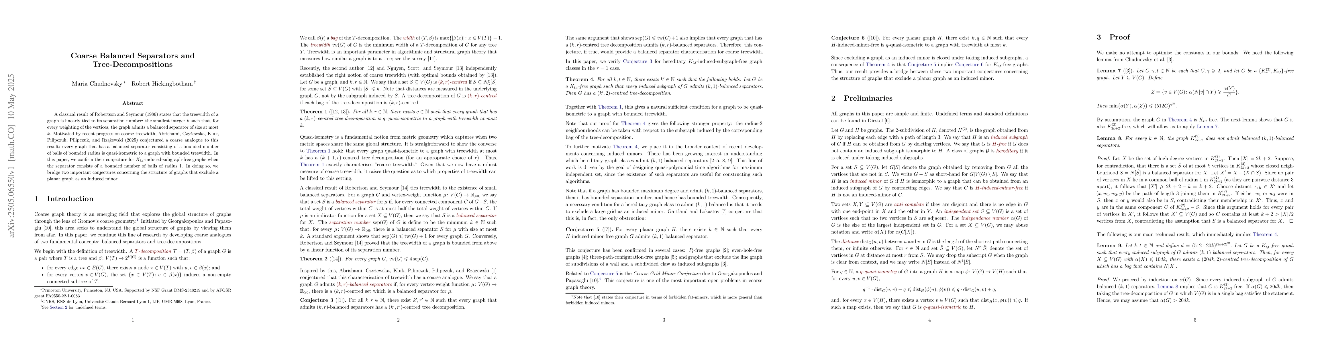 Introduced a proof technique linking coarse treewidth to balanced separators in specific graph classes, advancing the understanding of graph quasi-isometry and treewidth relationships.