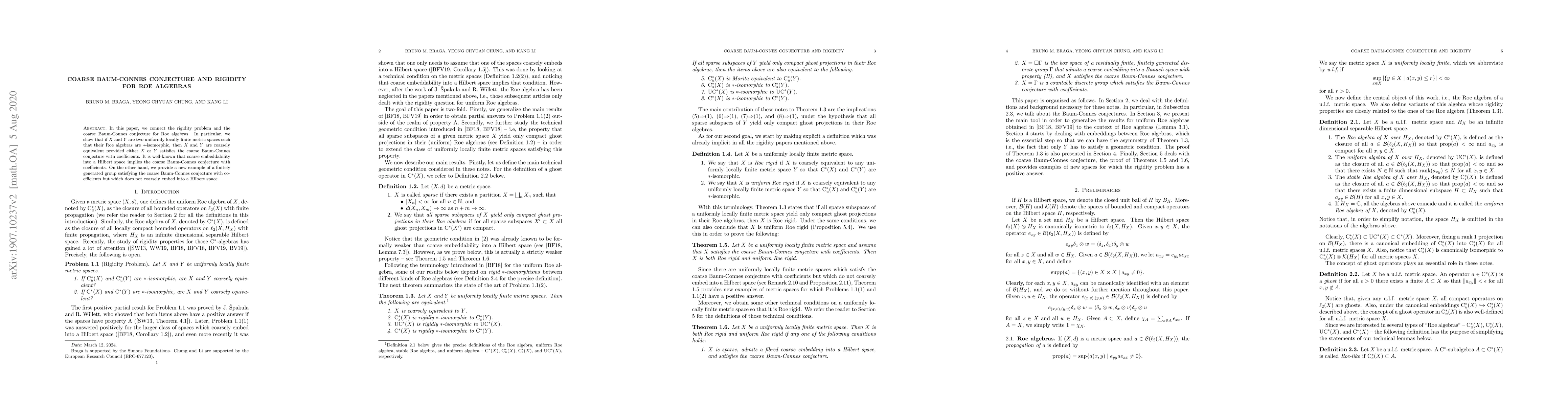 This paper establishes a link between the coarse Baum-Connes conjecture and the rigidity of Roe algebras, proving that $*$-isomorphic Roe algebras imply coarse equivalence between uniformly locally finite metric spaces under certain conditions. It also presents a group example that satisfies the conjecture but does not embed into a Hilbert space.