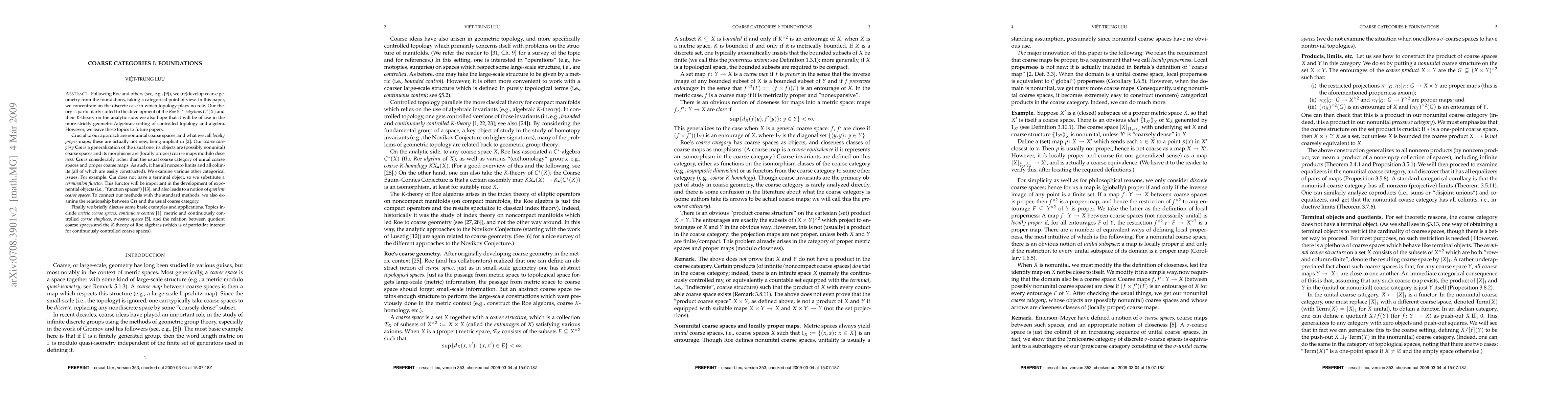 Following Roe and others (see, e.g., [MR1451755]), we (re)develop coarse geometry from the foundations, taking a categorical point of view. In this paper, we concentrate on the discrete case in which topology plays no role. Our theory is particularly suited to the development of the_Roe (C*-)algebras_ C*(X) and their K-theory on the analytic side; we also hope that it will be of use in the strictly geometric/algebraic setting of controlled topology and algebra. We leave these topics to future papers. Crucial to our approach are nonunital coarse spaces, and what we call _locally proper_ maps (which are actually implicit in [MR1988817]). Our_coarse category_ Crs generalizes the usual one: its objects are nonunital coarse spaces and its morphisms (locally proper) coarse maps modulo_closeness_. Crs is much richer than the usual unital coarse category. As such, it has all nonzero limits and all colimits. We examine various other categorical issues. E.g., Crs does not have a terminal object, so we substitute a_termination functor_ which will be important in the development of exponential objects (i.e., "function spaces") and also leads to a notion of_quotient coarse spaces_. To connect our methods with the standard methods, we also examine the relationship between Crs and the usual coarse category of Roe. Finally we briefly discuss some basic examples and applications. Topics include_metric coarse spaces_,_continuous control_ [MR1277522], metric and continuously controlled_coarse simplices_,_sigma-coarse spaces_ [MR2225040], and the relation between quotient coarse spaces and the K-theory of Roe algebras (of particular interest for continuously controlled coarse spaces).