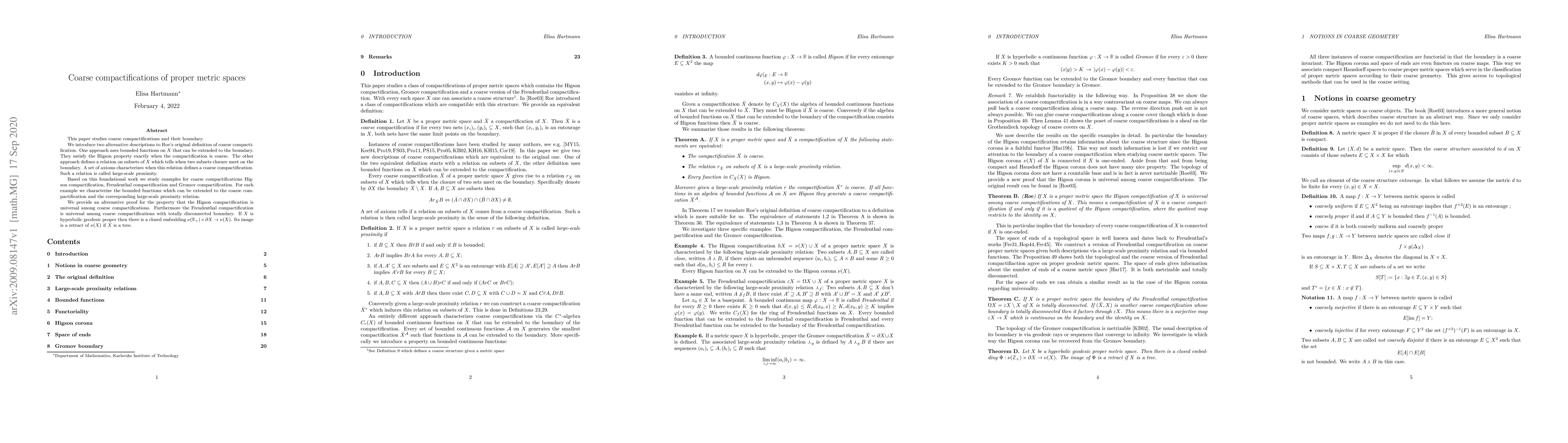 This paper explores alternative definitions and properties of coarse compactifications of proper metric spaces, introducing bounded functions and large-scale proximity relations. It provides examples and proves the universality of Higson and Freudenthal compactifications, and discusses embeddings for hyperbolic geodesic spaces.