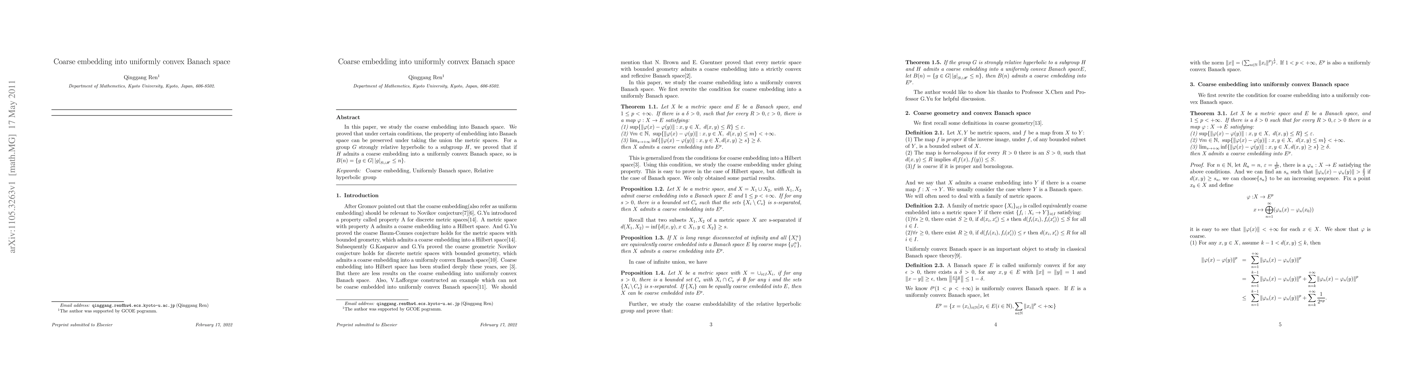 Researchers proved that if a subgroup of a group is coarsely embedded into a uniformly convex Banach space, then the entire group can also be coarsely embedded under specific conditions.
