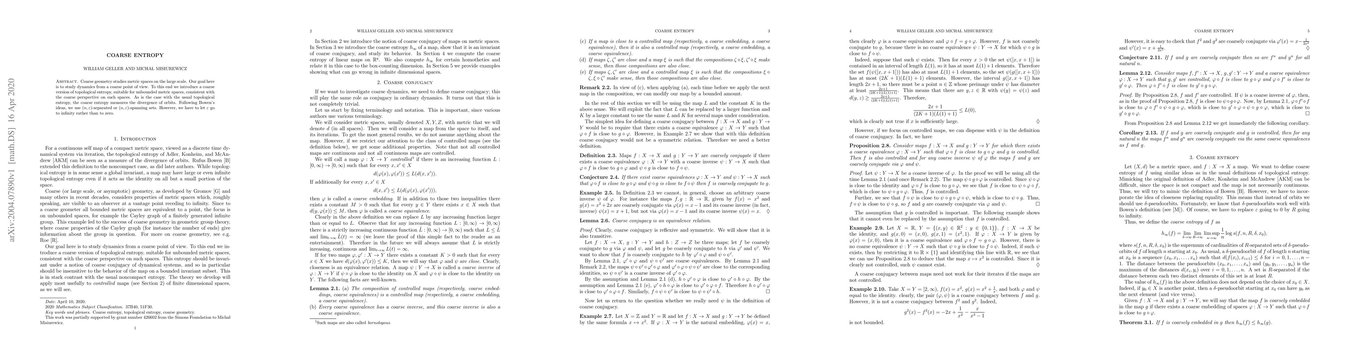 Coarse geometry studies metric spaces on the large scale. Our goal here is to study dynamics from a coarse point of view. To this end we introduce a coarse version of topological entropy, suitable for unbounded metric spaces, consistent with the coarse perspective on such spaces. As is the case with the usual topological entropy, the coarse entropy measures the divergence of orbits. Following Bowen's ideas, we use $(n,\varepsilon)$-separated or $(n,\varepsilon)$-spanning sets. However, we have to let $\varepsilon$ go to infinity rather than to zero.