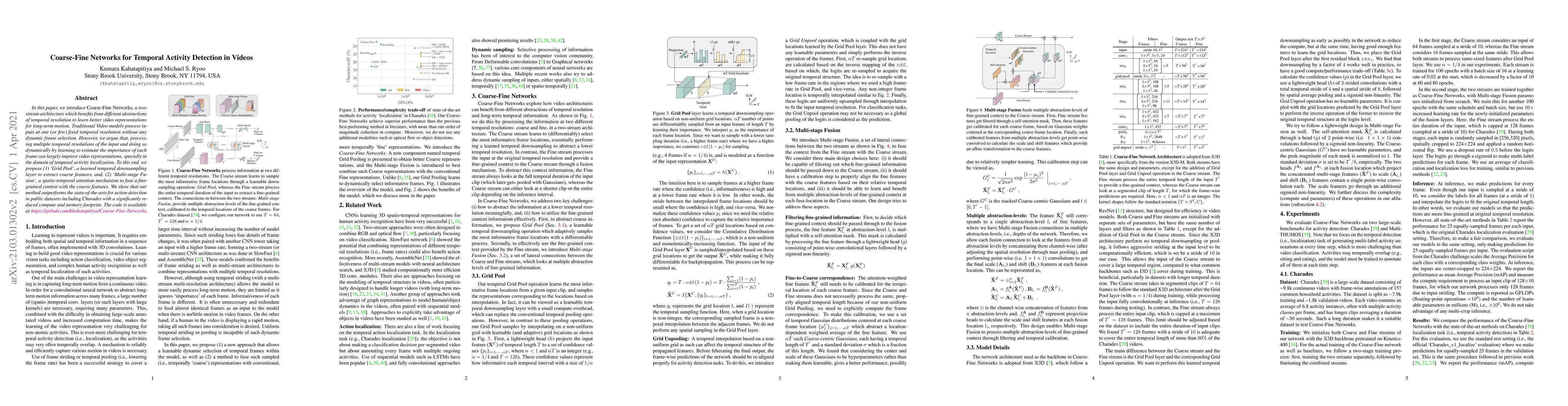 In this paper, we introduce Coarse-Fine Networks, a two-stream architecture which benefits from different abstractions of temporal resolution to learn better video representations for long-term motion. Traditional Video models process inputs at one (or few) fixed temporal resolution without any dynamic frame selection. However, we argue that, processing multiple temporal resolutions of the input and doing so dynamically by learning to estimate the importance of each frame can largely improve video representations, specially in the domain of temporal activity localization. To this end, we propose (1) Grid Pool, a learned temporal downsampling layer to extract coarse features, and, (2) Multi-stage Fusion, a spatio-temporal attention mechanism to fuse a fine-grained context with the coarse features. We show that our method outperforms the state-of-the-arts for action detection in public datasets including Charades with a significantly reduced compute and memory footprint. The code is available at https://github.com/kkahatapitiya/Coarse-Fine-Networks