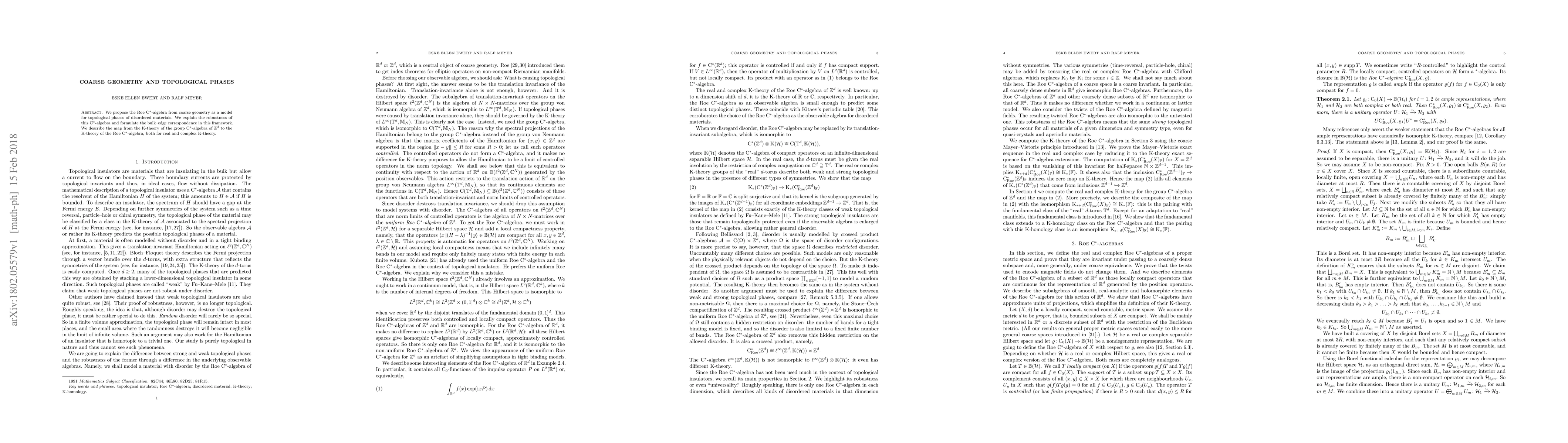 We propose the Roe C*-algebra from coarse geometry as a model for topological phases of disordered materials. We explain the robustness of this C*-algebra and formulate the bulk-edge correspondence in this framework. We describe the map from the K-theory of the group C*-algebra of Z^d to the K-theory of the Roe C*-algebra, both for real and complex K-theory.