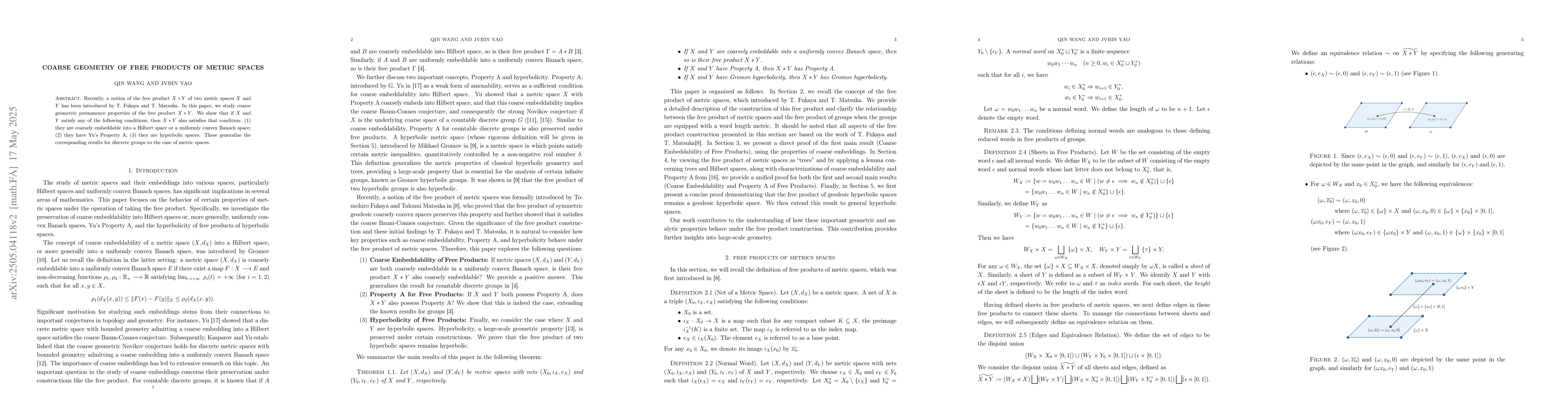 This paper studies coarse geometric properties of free products of metric spaces, showing that certain conditions (coarse embeddability into Hilbert space, Yu Property A, hyperbolicity) imply permanence for the free product, generalizing results from discrete groups to metric spaces.
