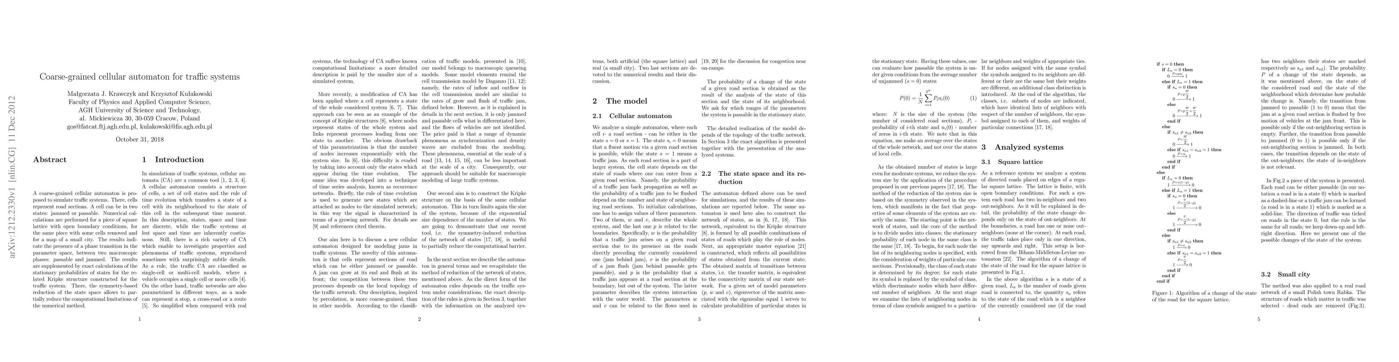 A coarse-grained cellular automaton is proposed to simulate traffic systems. There, cells represent road sections. A cell can be in two states: jammed or passable. Numerical calculations are performed for a piece of square lattice with open boundary conditions, for the same piece with some cells removed and for a map of a small city. The results indicate the presence of a phase transition in the parameter space, between two macroscopic phases: passable and jammed. The results are supplemented by exact calculations of the stationary probabilities of states for the related Kripke structure constructed for the traffic system. There, the symmetry-based reduction of the state space allows to partially reduce the computational limitations of the numerical method.