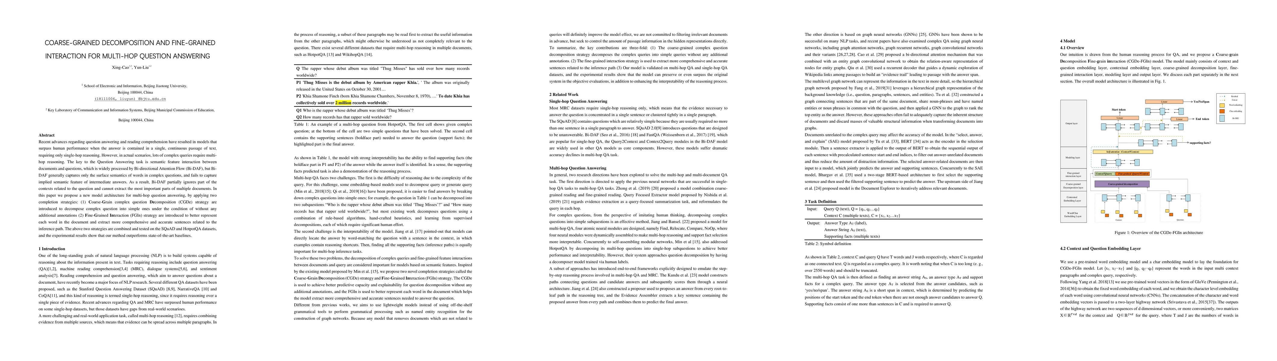 This paper proposes a new model for multi-hop question answering that employs coarse-grained decomposition and fine-grained interaction strategies. The CGDe strategy decomposes complex questions into simpler parts, while the FGIn strategy enhances semantic feature interaction for better context extraction, leading to improved performance on the SQuAD and HotpotQA datasets.