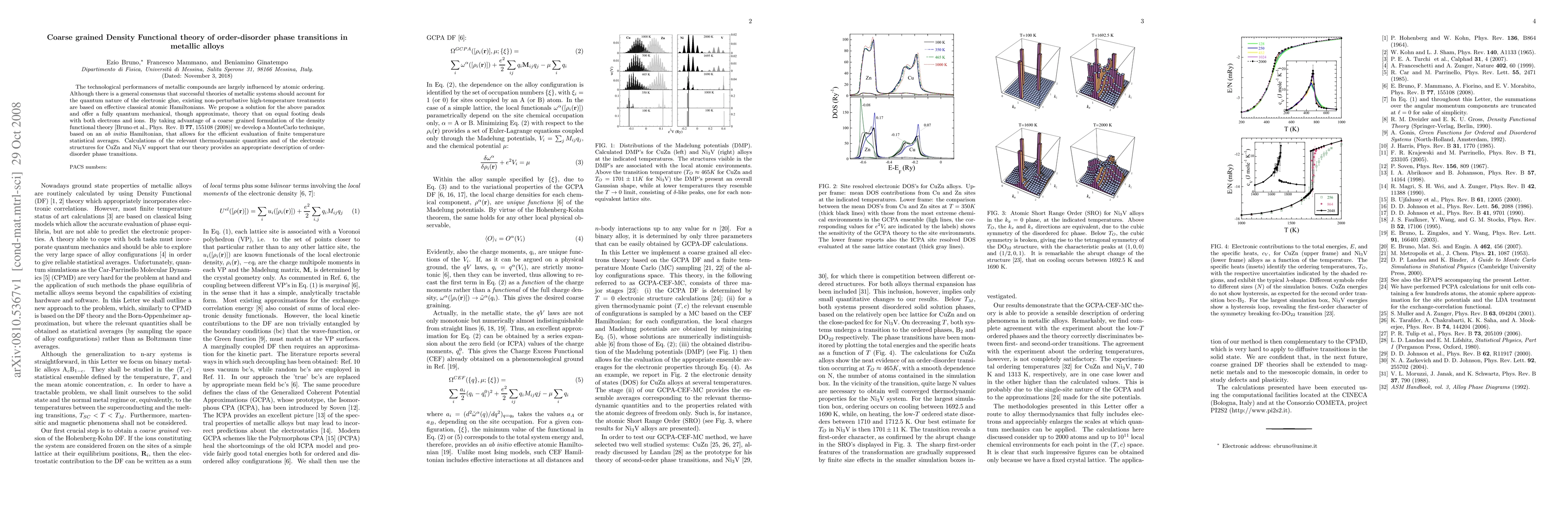 The technological performances of metallic compounds are largely influenced by atomic ordering. Although there is a general consensus that successful theories of metallic systems should account for the quantum nature of the electronic glue, existing non-perturbative high-temperature treatments are based on effective classical atomic Hamiltonians. We propose a solution for the above paradox and offer a fully quantum mechanical, though approximate, theory that on equal footing deals with both electrons and ions. By taking advantage of a coarse grained formulation of the density functional theory [Bruno et al., Phys. Rev. B 77, 155108 (2008)] we develop a MonteCarlo technique, based on an ab initio Hamiltonian, that allows for the efficient evaluation of finite temperature statistical averages. Calculations of the relevant thermodynamic quantities and of the electronic structures for CuZn and Ni$_3$V support that our theory provides an appropriate description of order-disorder phase transitions.