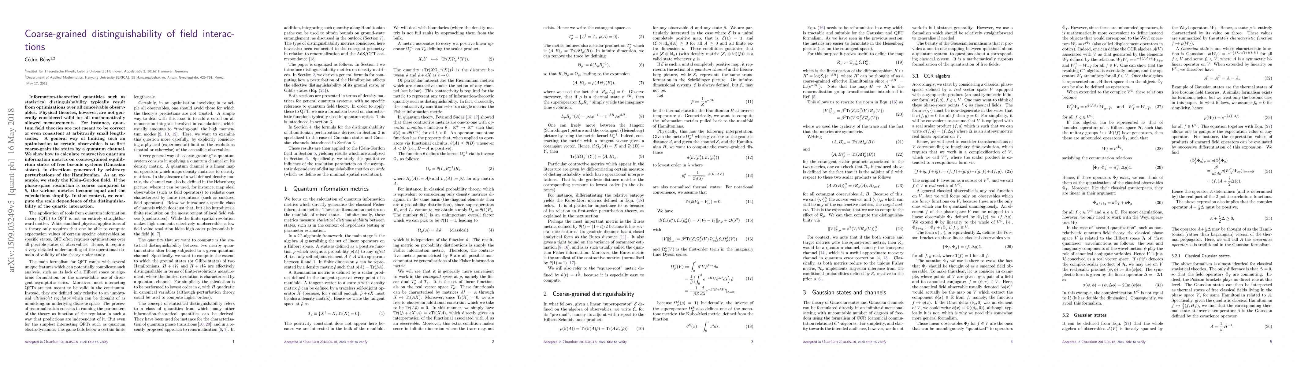 Information-theoretical quantities such as statistical distinguishability typically result from optimisations over all conceivable observables. Physical theories, however, are not generally considered valid for all mathematically allowed measurements. For instance, quantum field theories are not meant to be correct or even consistent at arbitrarily small lengthscales. A general way of limiting such an optimisation to certain observables is to first coarse-grain the states by a quantum channel. We show how to calculate contractive quantum information metrics on coarse-grained equilibrium states of free bosonic systems (Gaussian states), in directions generated by arbitrary perturbations of the Hamiltonian. As an example, we study the Klein-Gordon field. If the phase-space resolution is coarse compared to h-bar, the various metrics become equal and the calculations simplify. In that context, we compute the scale dependence of the distinguishability of the quartic interaction.