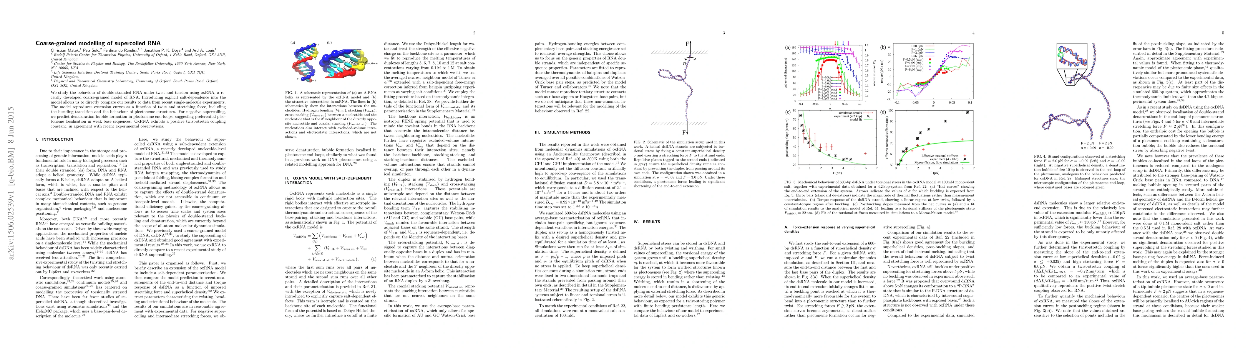 The study utilizes the oxRNA coarse-grained model to investigate the mechanical properties of supercoiled RNA under twist and tension, showing agreement with recent experimental data. The model predicts denaturation bubble formation and plectoneme localization in weak base sequences for negative supercoiling.