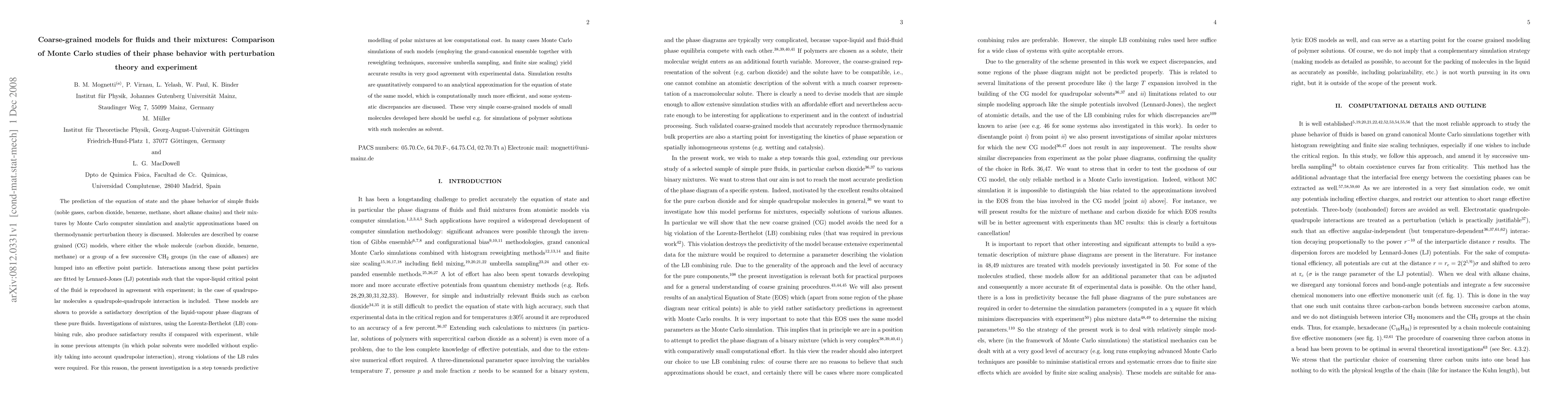 The prediction of the equation of state and the phase behavior of simple fluids (noble gases, carbon dioxide, benzene, methane, short alkane chains) and their mixtures by Monte Carlo computer simulation and analytic approximations based on thermodynamic perturbation theory is discussed. Molecules are described by coarse grained (CG) models, where either the whole molecule (carbon dioxide, benzene, methane) or a group of a few successive CH_2 groups (in the case of alkanes) are lumped into an effective point particle. Interactions among these point particles are fitted by Lennard-Jones (LJ) potentials such that the vapor-liquid critical point of the fluid is reproduced in agreement with experiment; in the case of quadrupolar molecules a quadrupole-quadrupole interaction is included. These models are shown to provide a satisfactory description of the liquid-vapour phase diagram of these pure fluids. Investigations of mixtures, using the Lorentz-Berthelot (LB) combining rule, also produce satisfactory results if compared with experiment, while in some previous attempts (in which polar solvents were modelled without explicitly taking into account quadrupolar interaction), strong violations of the LB rules were required. For this reason, the present investigation is a step towards predictive modelling of polar mixtures at low computational cost. These very simple coarse-grained models of small molecules developed here should be useful e.g. for simulations of polymer solutions with such molecules as solvent.