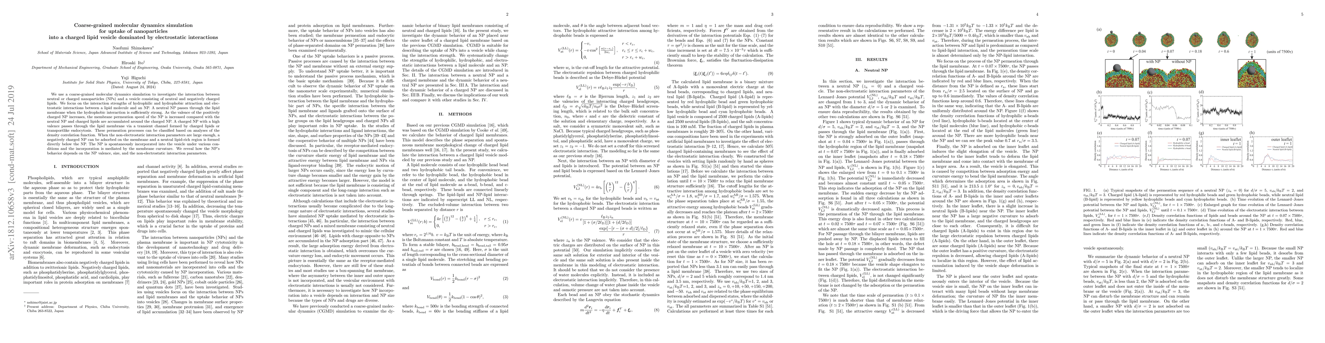 This study employs coarse-grained molecular dynamics simulations to explore how neutral and charged nanoparticles interact with and permeate charged lipid vesicles, focusing on the roles of electrostatic, hydrophilic, and hydrophobic forces. The findings show that charged nanoparticles with higher valences form transient channels or undergo endocytosis, while neutral nanoparticles rely on strong hydrophobic interactions to pass through the membrane.
