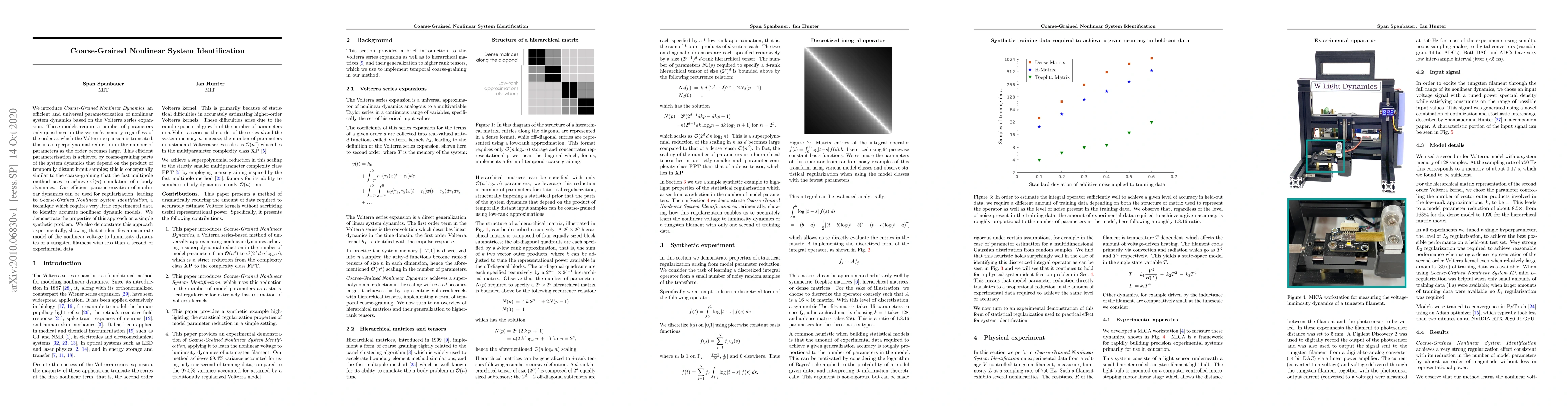 This paper introduces Coarse-Grained Nonlinear Dynamics, a method for efficiently parameterizing nonlinear system dynamics using the Volterra series expansion, which significantly reduces the number of parameters. This technique enables accurate nonlinear system identification with minimal experimental data, demonstrated through synthetic and experimental examples involving a tungsten filament.