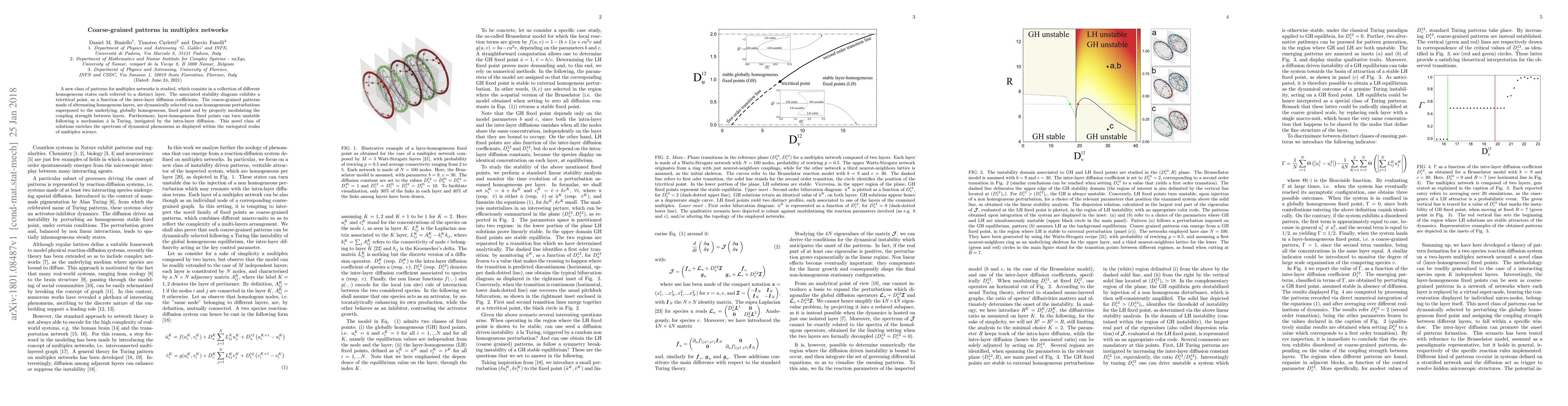 A new class of patterns for multiplex networks is studied, which consists in a collection of different homogeneous states each referred to a distinct layer. The associated stability diagram exhibits a tricritical point, as a function of the inter-layer diffusion coefficients. The coarse-grained patterns made of alternating homogenous layers, are dynamically selected via non homogeneous perturbations superposed to the underlying, globally homogeneous, fixed point and by properly modulating the coupling strength between layers. Furthermore, layer-homogenous fixed points can turn unstable following a mechanism \`a la Turing, instigated by the intra-layer diffusion. This novel class of solutions enriches the spectrum of dynamical phenomena as displayed within the variegated realm of multiplex science.