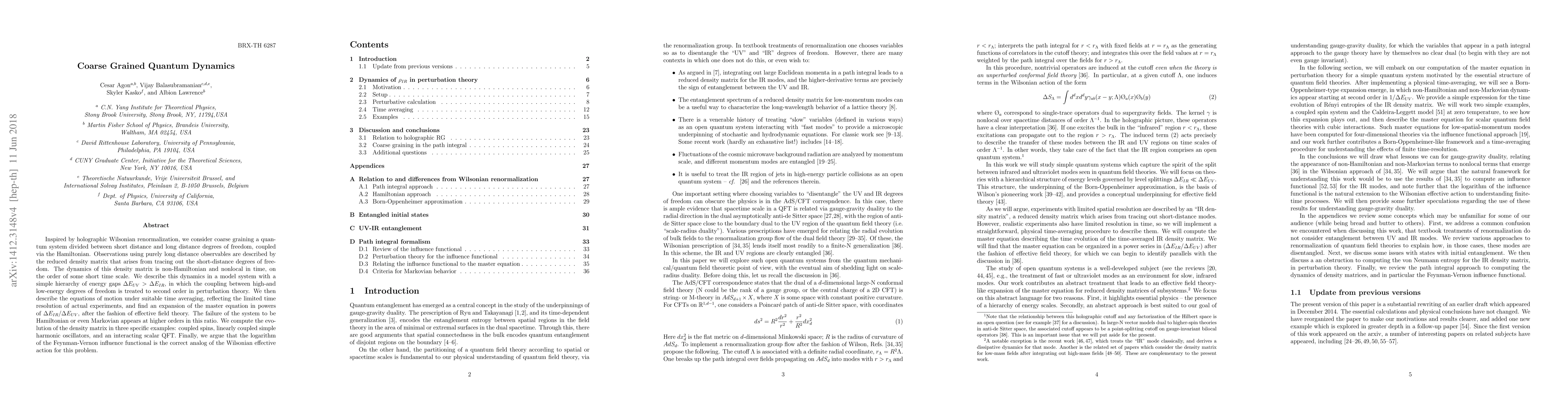 Inspired by holographic Wilsonian renormalization, we consider coarse graining a quantum system divided between short distance and long distance degrees of freedom, coupled via the Hamiltonian. Observations using purely long distance observables are described by the reduced density matrix that arises from tracing out the short-distance degrees of freedom. The dynamics of this density matrix is non-Hamiltonian and nonlocal in time, on the order of some short time scale. We describe this dynamics in a model system with a simple hierarchy of energy gaps $\Delta E_{UV} > \Delta E_{IR}$, in which the coupling between high-and low-energy degrees of freedom is treated to second order in perturbation theory. We then describe the equations of motion under suitable time averaging, reflecting the limited time resolution of actual experiments, and find an expansion of the master equation in powers of $\Delta E_{IR}/\Delta E_{UV}$, after the fashion of effective field theory. The failure of the system to be Hamiltonian or even Markovian appears at higher orders in this ratio. We compute the evolution of the density matrix in three specific examples: coupled spins, linearly coupled simple harmonic oscillators, and an interacting scalar QFT. Finally, we argue that the logarithm of the Feynman-Vernon influence functional is the correct analog of the Wilsonian effective action for this problem.