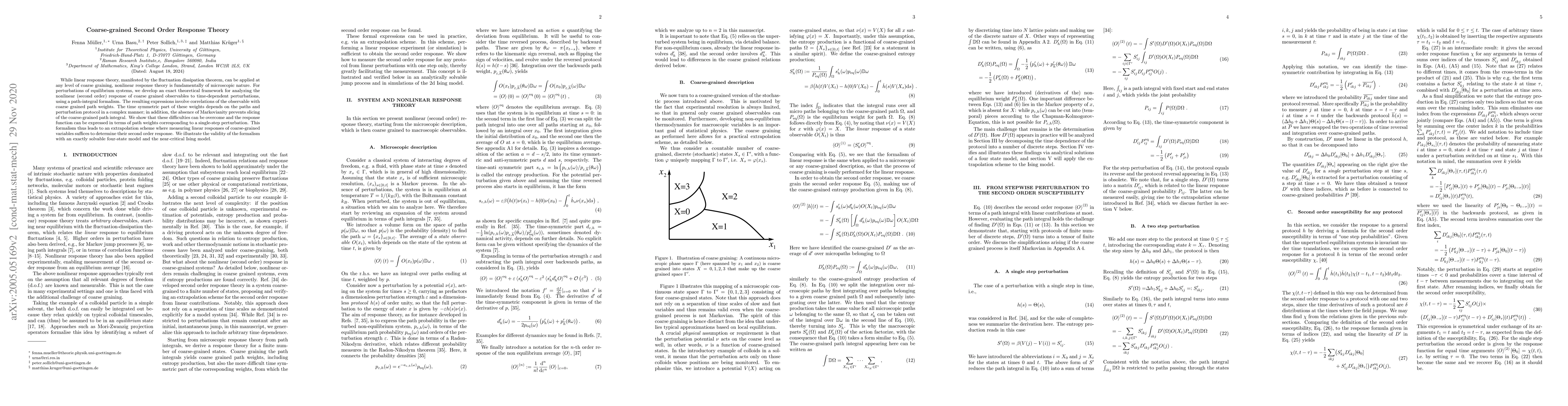 While linear response theory, manifested by the fluctuation dissipation theorem, can be applied at any level of coarse graining, nonlinear response theory is fundamentally of microscopic nature. For perturbations of equilibrium systems, we develop an exact theoretical framework for analyzing the nonlinear (second order) response of coarse grained observables to time-dependent perturbations, using a path-integral formalism. The resulting expressions involve correlations of the observable with coarse grained path weights. The time symmetric part of these weights depends on the paths and perturbation protocol in a complex manner; in addition, the absence of Markovianity prevents slicing of the coarse-grained path integral. We show that these difficulties can be overcome and the response function can be expressed in terms of path weights corresponding to a single-step perturbation. This formalism thus leads to an extrapolation scheme where measuring linear responses of coarse-grained variables suffices to determine their second order response. We illustrate the validity of the formalism with an exactly solvable four-state model and the near-critical Ising model.