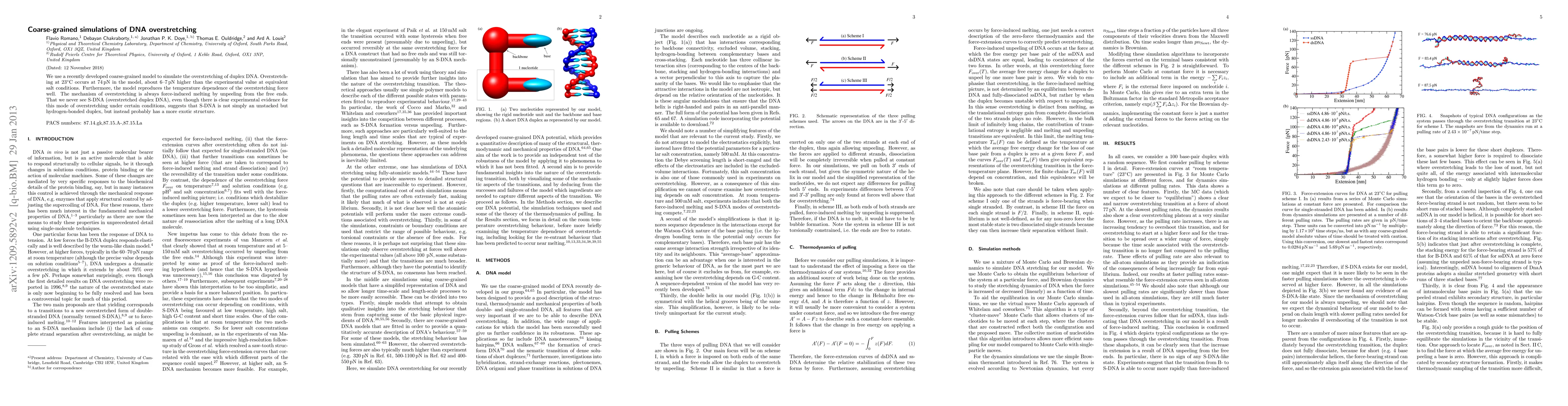 This study employs a coarse-grained model to simulate DNA overstretching, finding force-induced melting from the free ends at 74 pN at 23°C, higher than experimental values, but accurately reproducing temperature dependence. It proposes that S-DNA likely has a unique structure beyond a simple unstacked duplex due to the model's lack of S-DNA formation despite experimental evidence.