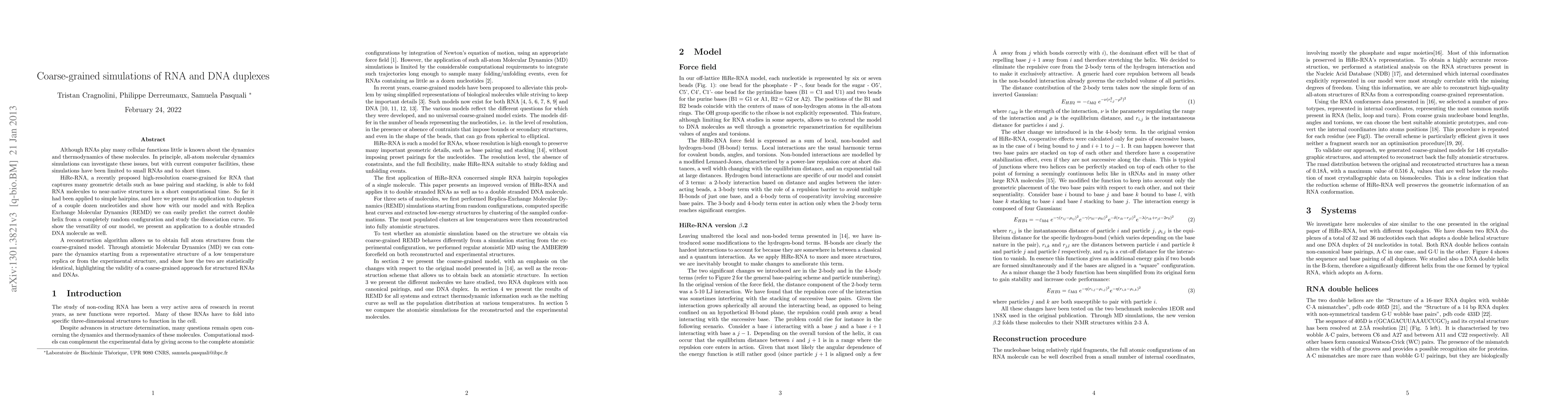 This paper applies the HiRe-RNA coarse-grained model to RNA and DNA duplexes, demonstrating its ability to fold near-native structures quickly and predict double helix formation and dissociation curves via Replica Exchange Molecular Dynamics. It also validates the model's accuracy by comparing atomistic MD simulations starting from coarse-grained models and experimental structures.