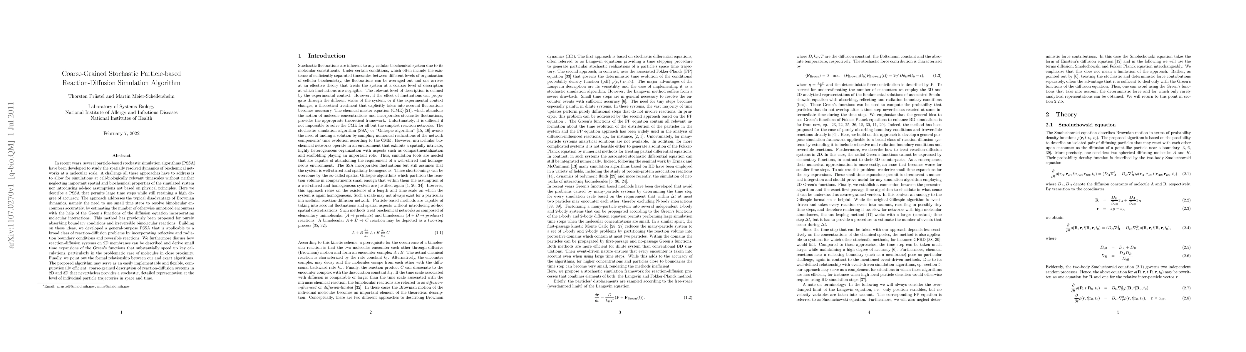 This paper introduces a coarse-grained stochastic particle-based simulation algorithm that allows for large time steps in reaction-diffusion systems while maintaining accuracy. It extends previous methods by incorporating reflective and radiation boundary conditions and reversible reactions, and provides efficient calculations for 2D membranes.