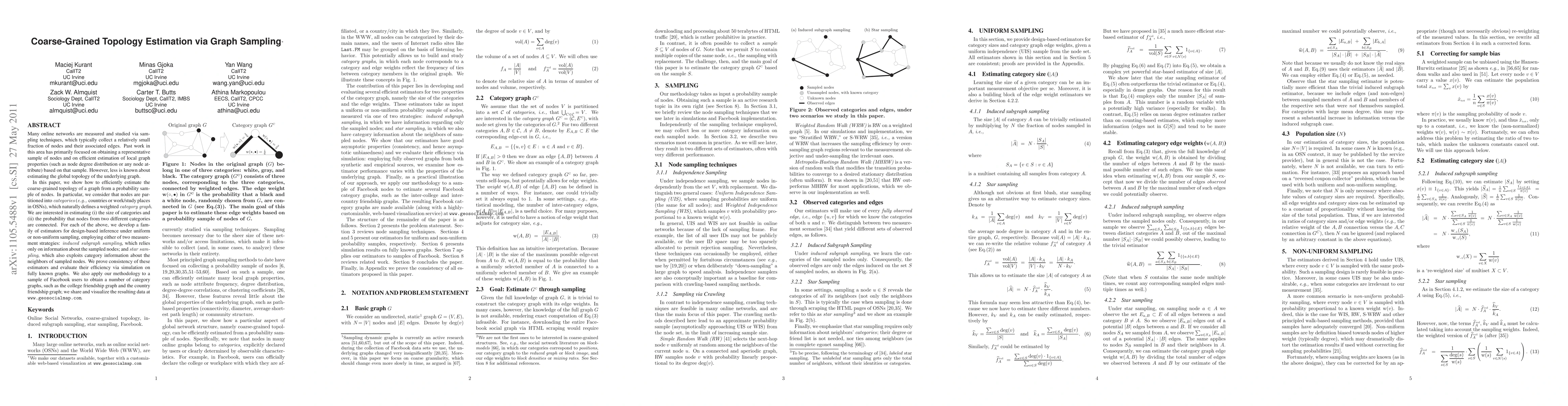 Many online networks are measured and studied via sampling techniques, which typically collect a relatively small fraction of nodes and their associated edges. Past work in this area has primarily focused on obtaining a representative sample of nodes and on efficient estimation of local graph properties (such as node degree distribution or any node attribute) based on that sample. However, less is known about estimating the global topology of the underlying graph. In this paper, we show how to efficiently estimate the coarse-grained topology of a graph from a probability sample of nodes. In particular, we consider that nodes are partitioned into categories (e.g., countries or work/study places in OSNs), which naturally defines a weighted category graph. We are interested in estimating (i) the size of categories and (ii) the probability that nodes from two different categories are connected. For each of the above, we develop a family of estimators for design-based inference under uniform or non-uniform sampling, employing either of two measurement strategies: induced subgraph sampling, which relies only on information about the sampled nodes; and star sampling, which also exploits category information about the neighbors of sampled nodes. We prove consistency of these estimators and evaluate their efficiency via simulation on fully known graphs. We also apply our methodology to a sample of Facebook users to obtain a number of category graphs, such as the college friendship graph and the country friendship graph; we share and visualize the resulting data at www.geosocialmap.com.