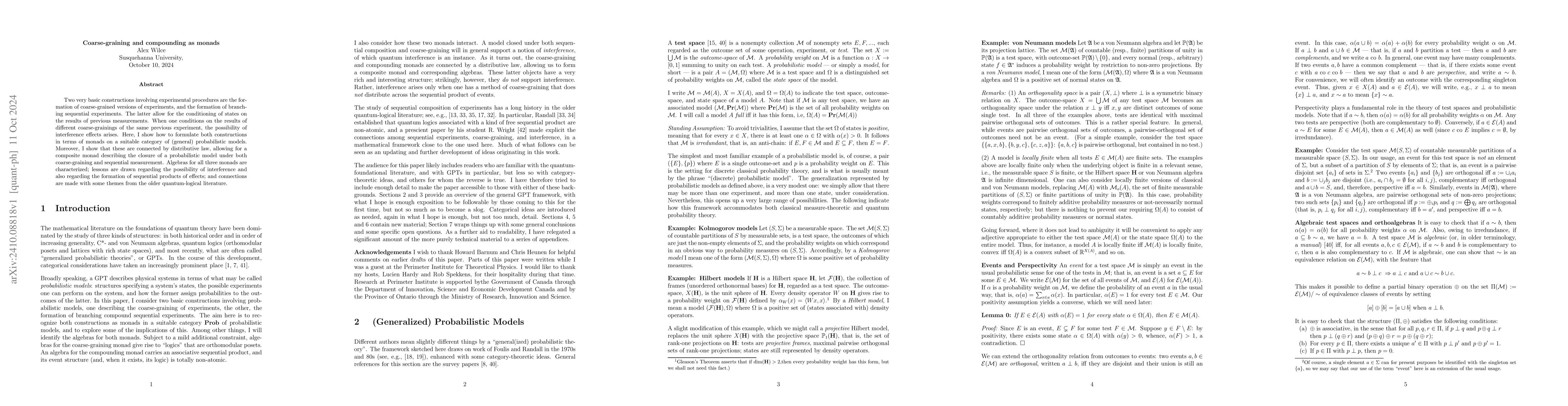 This paper explores the mathematical formulation of coarse-graining and sequential branching in experiments using monads, showing their connection via distributive laws and discussing the implications for interference and sequential measurement effects in probabilistic models. It also draws parallels with quantum-logical themes.