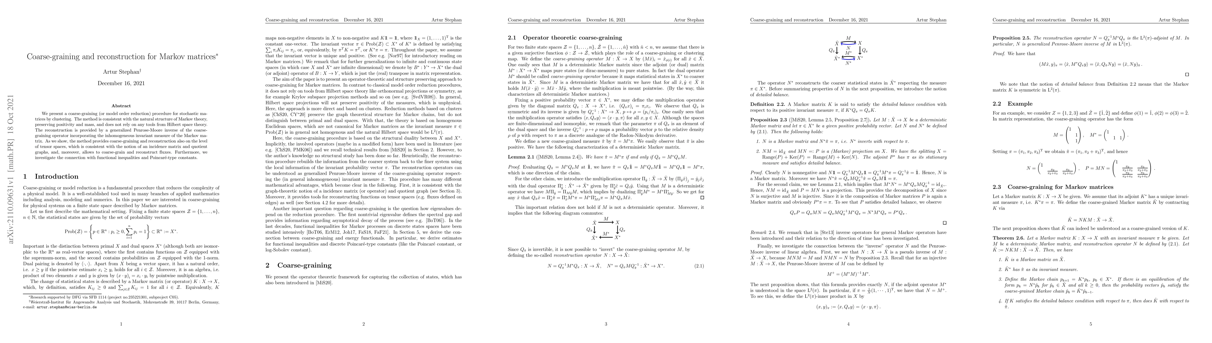We present a coarse-graining (or model order reduction) procedure for stochastic matrices by clustering. The method is consistent with the natural structure of Markov theory, preserving positivity and mass, and does not rely on any tools from Hilbert space theory. The reconstruction is provided by a generalized Penrose-Moore inverse of the coarse-graining operator incorporating the inhomogeneous invariant measure of the Markov matrix. As we show, the method provides coarse-graining and reconstruction also on the level of tensor spaces, which is consistent with the notion of an incidence matrix and quotient graphs, and, moreover, allows to coarse-grain and reconstruct fluxes. Furthermore, we investigate the connection with functional inequalities and Poincar\'e-type constants.