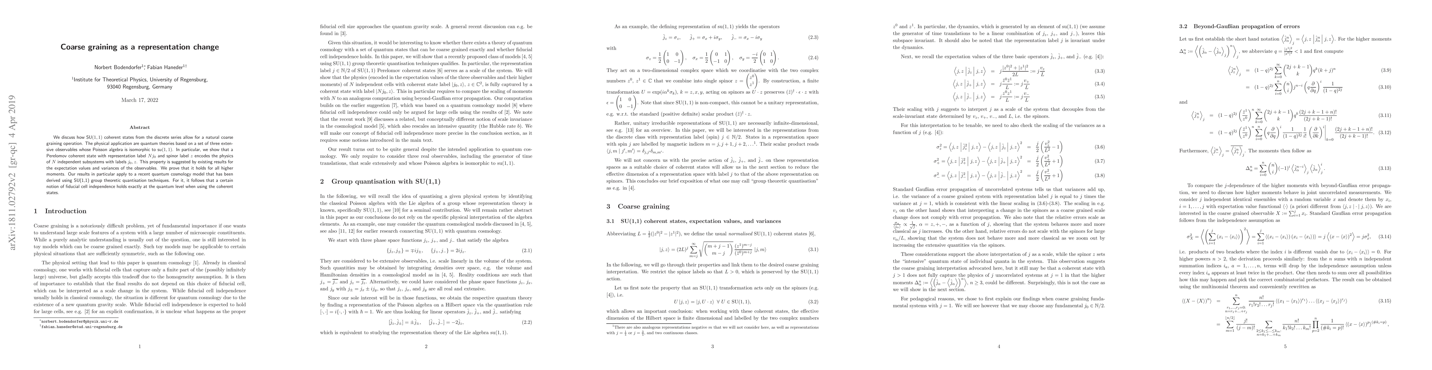 We discuss how SU$(1,1)$ coherent states from the discrete series allow for a natural coarse graining operation. The physical application are quantum theories based on a set of three extensive observables whose Poisson algebra is isomorphic to su$(1,1)$. In particular, we show that a Perelomov coherent state with representation label $N j_0$ and spinor label $z$ encodes the physics of $N$ independent subsystems with labels $j_0, z$. This property is suggested by existing results for the expectation values and variances of the observables. We prove that it holds for all higher moments. Our results in particular apply to a recent quantum cosmology model that has been derived using SU(1,1) group theoretic quantisation techniques. For it, it follows that a certain notion of fiducial cell independence holds exactly at the quantum level when using the coherent states.