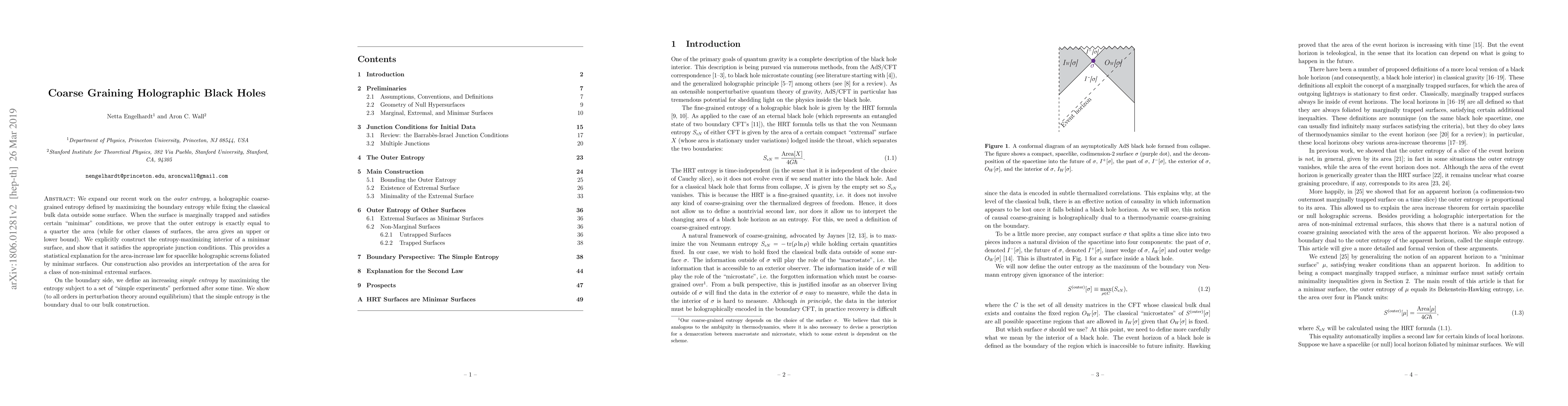 We expand our recent work on the outer entropy, a holographic coarse-grained entropy defined by maximizing the boundary entropy while fixing the classical bulk data outside some surface. When the surface is marginally trapped and satisfies certain "minimar" conditions, we prove that the outer entropy is exactly equal to a quarter the area (while for other classes of surfaces, the area gives an upper or lower bound). We explicitly construct the entropy-maximizing interior of a minimar surface, and show that it satisfies the appropriate junction conditions. This provides a statistical explanation for the area-increase law for spacelike holographic screens foliated by minimar surfaces. Our construction also provides an interpretation of the area for a class of non-minimal extremal surfaces. On the boundary side, we define an increasing simple entropy by maximizing the entropy subject to a set of "simple experiments" performed after some time. We show (to all orders in perturbation theory around equilibrium) that the simple entropy is the boundary dual to our bulk construction.