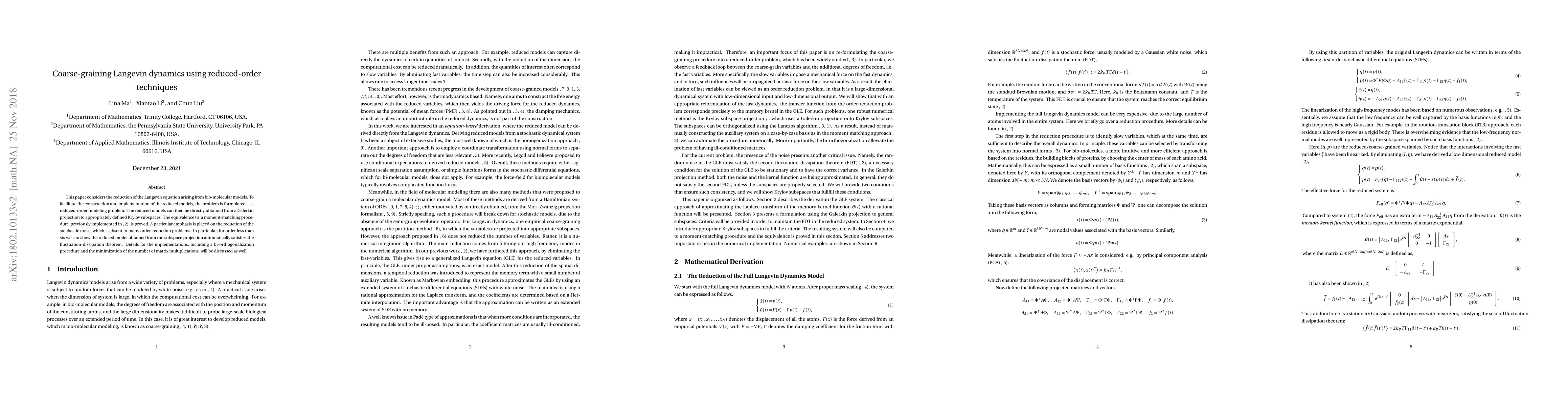 This paper considers the reduction of the Langevin equation arising from bio-molecular models. To facilitate the construction and implementation of the reduced models, the problem is formulated as a reduced-order modeling problem. The reduced models can then be directly obtained from a Galerkin projection to appropriately defined Krylov subspaces. The equivalence to a moment-matching procedure, previously implemented in , 2), is proved. A particular emphasis is placed on the reduction of the stochastic noise, which is absent in many order-reduction problems. In particular, for order less than six we can show the reduced model obtained from the subspace projection automatically satisfies the fluctuation-dissipation theorem. Details for the implementations, including a bi-orthogonalization procedure and the minimization of the number of matrix multiplications, will be discussed as well.