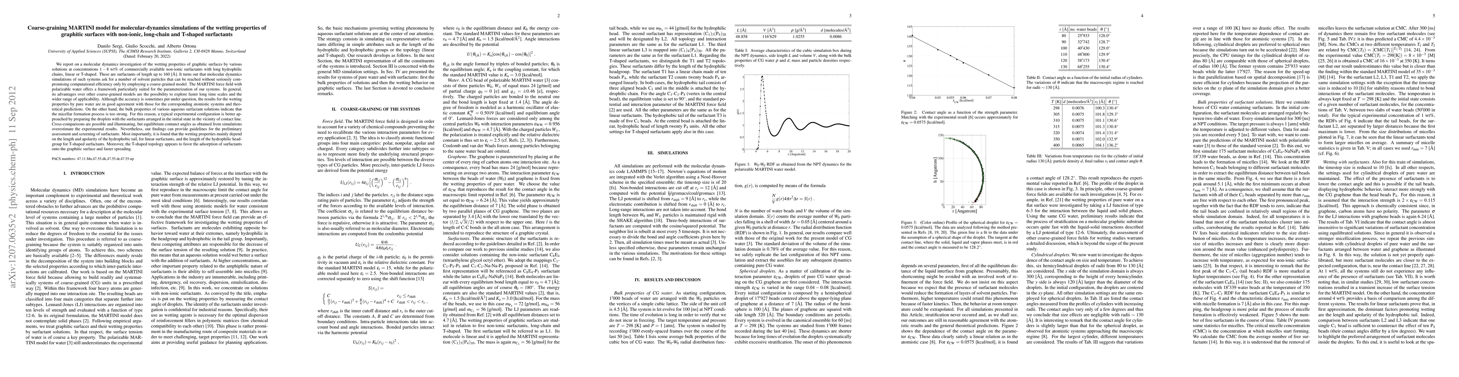 We report on a molecular dynamics investigation of the wetting properties of graphitic surfaces by various solutions at concentrations 1-8 wt% of commercially available non-ionic surfactants with long hydrophilic chains, linear or T-shaped. These are surfactants of length up to 160 [\AA]. It turns out that molecular dynamics simulations of such systems ask for a number of solvent particles that can be reached without seriously compromising computational efficiency only by employing a coarse-grained model. The MARTINI force field with polarizable water offers a framework particularly suited for the parameterization of our systems. In general, its advantages over other coarse-grained models are the possibility to explore faster long time scales and the wider range of applicability. Although the accuracy is sometimes put under question, the results for the wetting properties by pure water are in good agreement with those for the corresponding atomistic systems and theoretical predictions. On the other hand, the bulk properties of various aqueous surfactant solutions indicate that the micellar formation process is too strong. For this reason, a typical experimental configuration is better approached by preparing the droplets with the surfactants arranged in the initial state in the vicinity of contact line. Cross-comparisons are possible and illuminating, but equilibrium contanct angles as obtained from simulations overestimate the experimental results. Nevertheless, our findings can provide guidelines for the preliminary assessment and screening of surfactants. [See pdf file for full abstract]