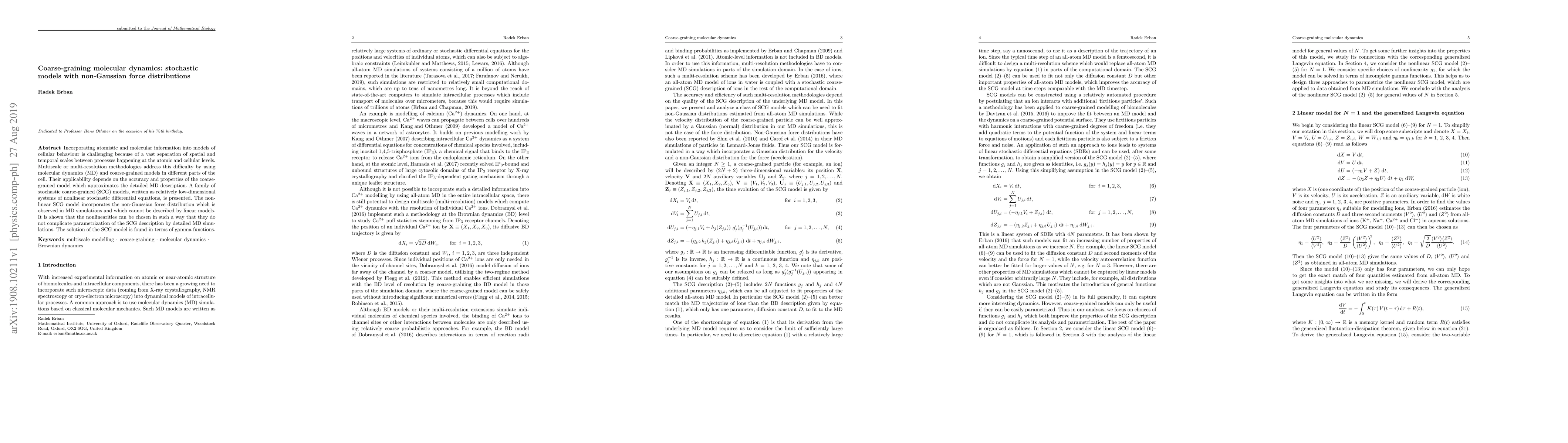 Incorporating atomistic and molecular information into models of cellular behaviour is challenging because of a vast separation of spatial and temporal scales between processes happening at the atomic and cellular levels. Multiscale or multi-resolution methodologies address this difficulty by using molecular dynamics (MD) and coarse-grained models in different parts of the cell. Their applicability depends on the accuracy and properties of the coarse-grained model which approximates the detailed MD description. A family of stochastic coarse-grained (SCG) models, written as relatively low-dimensional systems of nonlinear stochastic differential equations, is presented. The nonlinear SCG model incorporates the non-Gaussian force distribution which is observed in MD simulations and which cannot be described by linear models. It is shown that the nonlinearities can be chosen in such a way that they do not complicate parametrization of the SCG description by detailed MD simulations. The solution of the SCG model is found in terms of gamma functions.