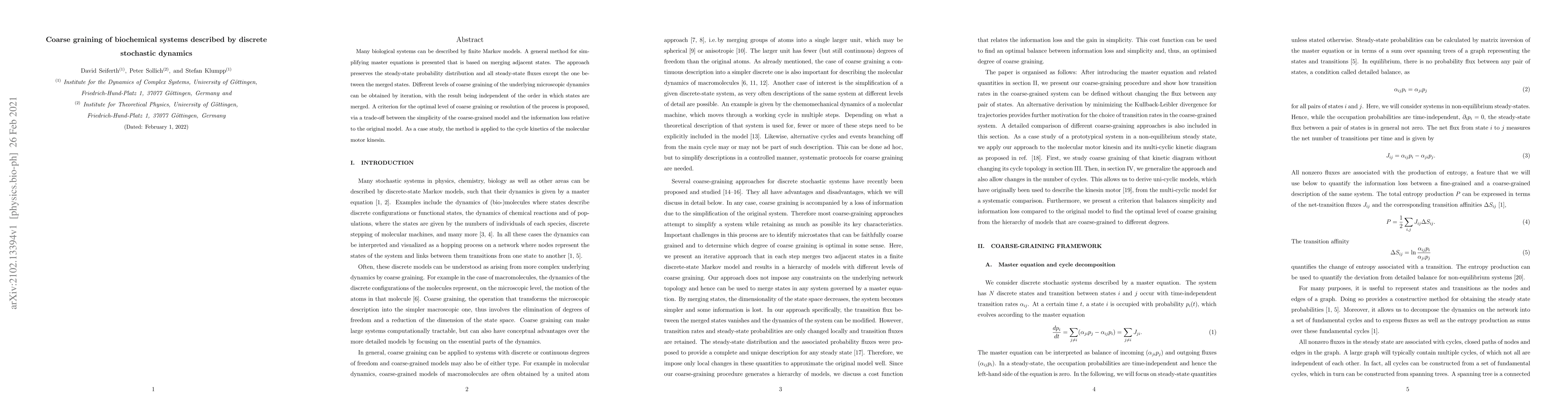 Many biological systems can be described by finite Markov models. A general method for simplifying master equations is presented that is based on merging adjacent states. The approach preserves the steady-state probability distribution and all steady-state fluxes except the one between the merged states. Different levels of coarse graining of the underlying microscopic dynamics can be obtained by iteration, with the result being independent of the order in which states are merged. A criterion for the optimal level of coarse graining or resolution of the process is proposed via a tradeoff between the simplicity of the coarse-grained model and the information loss relative to the original model. As a case study, the method is applied to the cycle kinetics of the molecular motor kinesin.