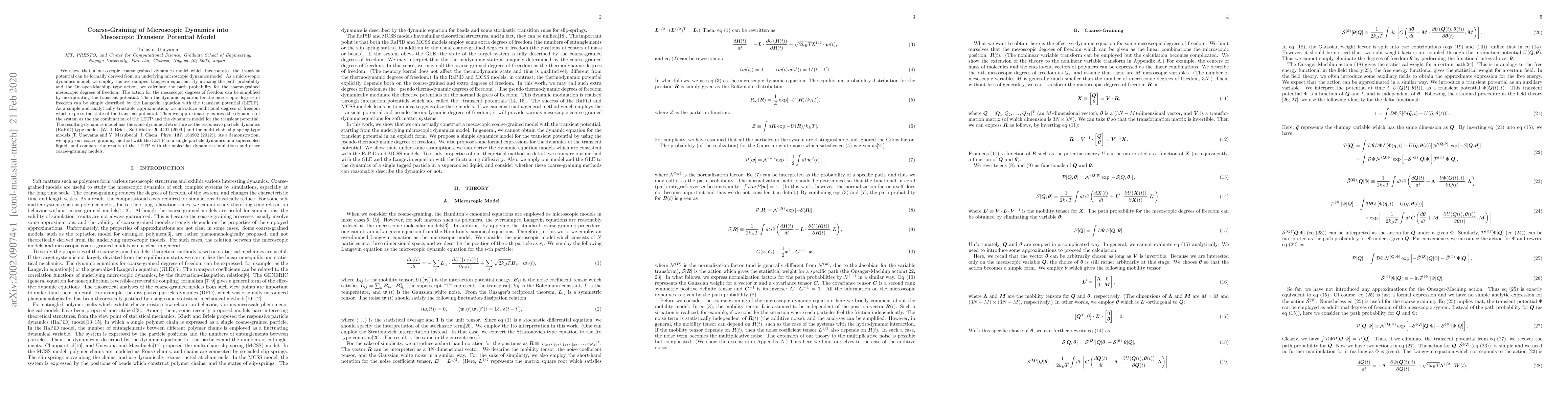 This paper derives a mesoscopic coarse-grained dynamics model incorporating a transient potential from an underlying microscopic dynamics model using the overdamped Langevin equation. The resulting model, the Langevin equation with the transient potential (LETP), combines the LETP with a simplified dynamics model for the transient potential, demonstrating similar dynamical structures to RaPiD and multi-chain slip-spring models.