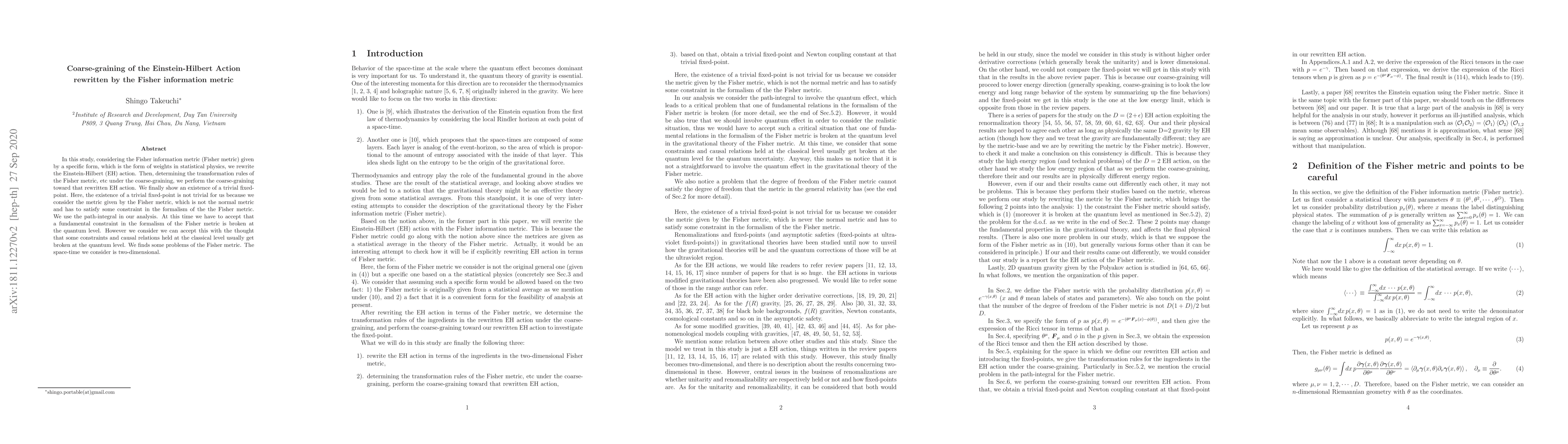 In this study, considering the Fisher information metric (Fisher metric) given by a specific form, which is the form of weights in statistical physics, we rewrite the Einstein-Hilbert (EH) action. Then, determining the transformation rules of the Fisher metric, etc under the coarse-graining, we perform the coarse-graining toward that rewritten EH action. We finally show an existence of a trivial fixed-point. Here, the existence of a trivial fixed-point is not trivial for us because we consider the metric given by the Fisher metric, which is not the normal metric and has to satisfy some constraint in the formalism of the the Fisher metric. We use the path-integral in our analysis. At this time we have to accept that a fundamental constraint in the formalism of the Fisher metric is broken at the quantum level. However we consider we can accept this with the thought that some constraints and causal relations held at the classical level usually get broken at the quantum level. We finds some problems of the Fisher metric. The space-time we consider is two-dimensional.