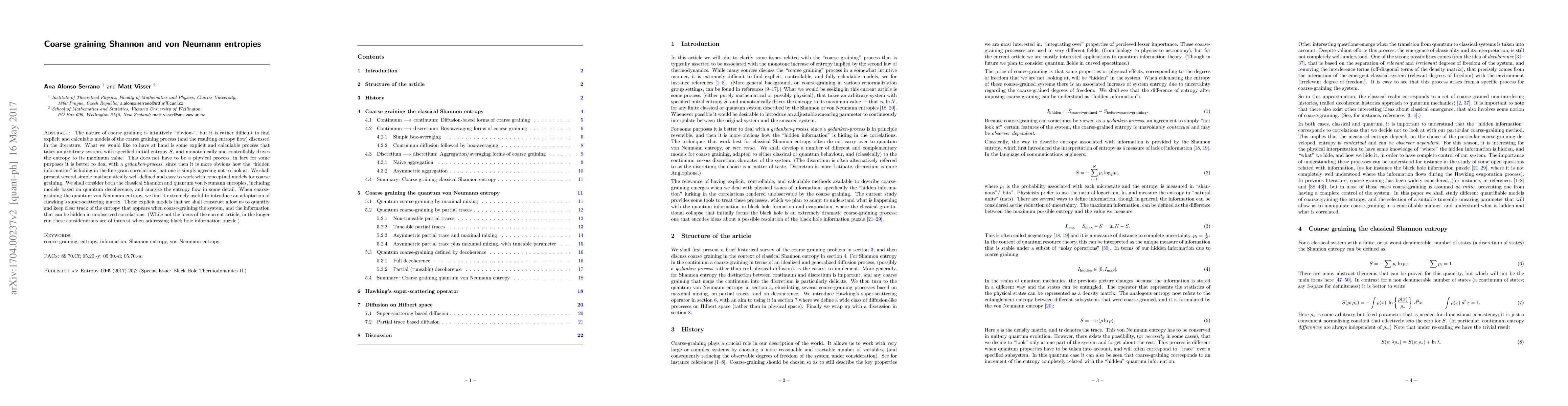 The nature of coarse graining is intuitively "obvious", but it is rather difficult to find explicit and calculable models of the coarse graining process (and the resulting entropy flow) discussed in the literature. What we would like to have at hand is some explicit and calculable process that takes an arbitrary system, with specified initial entropy S, and monotonically and controllably drives the entropy to its maximum value. This does not have to be a physical process, in fact for some purposes it is better to deal with a gedanken-process, since then it is more obvious how the "hidden information" is hiding in the fine-grain correlations that one is simply agreeing not to look at. We shall present several simple mathematically well-defined and easy to work with conceptual models for coarse graining. We shall consider both the classical Shannon and quantum von Neumann entropies, including models based on quantum decoherence, and analyze the entropy flow in some detail. When coarse-graining the quantum von Neumann entropy, we find it extremely useful to introduce an adaptation of Hawking's super-scattering matrix. These explicit models that we shall construct allow us to quantify and keep clear track of the entropy that appears when coarse-graining the system, and the information that can be hidden in unobserved correlations. (While not the focus of the current article, in the longer run these considerations are of interest when addressing black hole information puzzle.)