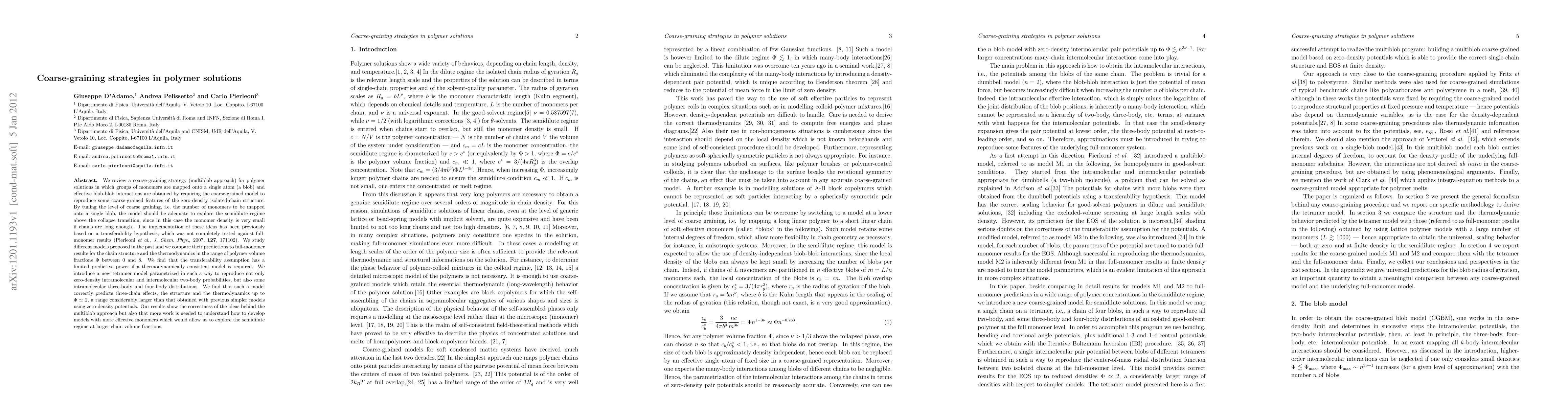 We review a coarse-graining strategy (multiblob approach) for polymer solutions in which groups of monomers are mapped onto a single atom (a blob) and effective blob-blob interactions are obtained by requiring the coarse-grained model to reproduce some coarse-grained features of the zero-density isolated-chain structure. By tuning the level of coarse graining, i.e. the number of monomers to be mapped onto a single blob, the model should be adequate to explore the semidilute regime above the collapse transition, since in this case the monomer density is very small if chains are long enough. The implementation of these ideas has been previously based on a transferability hypothesis, which was not completely tested against full-monomer results (Pierleoni et al., J. Chem. Phys, 127, 171102 (2007)). We study different models proposed in the past and we compare their predictions to full-monomer results for the chain structure and the thermodynamics in the range of polymer volume fractions \Phi between 0 and 8. We find that the transferability assumption has a limited predictive power if a thermodynamically consistent model is required. We introduce a new tetramer model parametrized in such a way to reproduce not only zero-density intramolecular and intermolecular two-body probabilities, but also some intramolecular three-body and four-body distributions. We find that such a model correctly predicts three-chain effects, the structure and the thermodynamics up to \Phi ~ 2, a range considerably larger than that obtained with previous simpler models using zero-density potentials. Our results show the correctness of the ideas behind the multiblob approach but also that more work is needed to understand how to develop models with more effective monomers which would allow us to explore the semidilute regime at larger chain volume fractions.