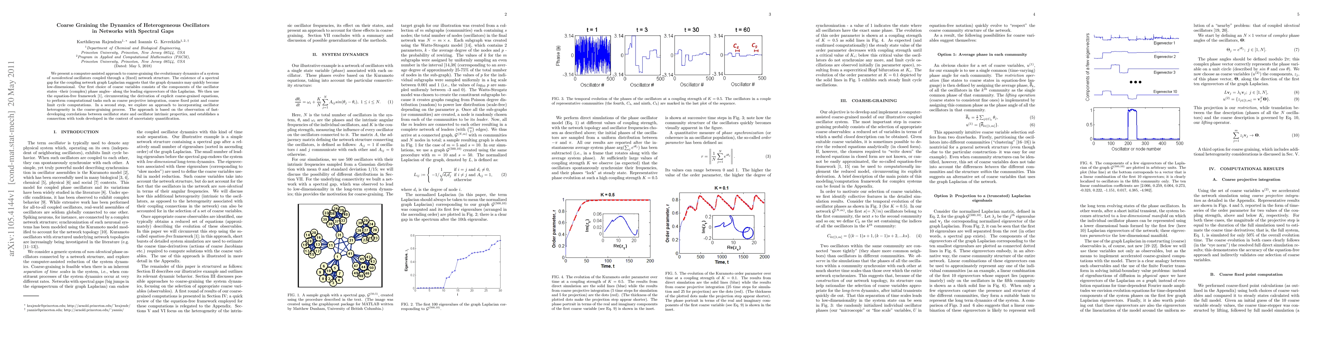We present a computer-assisted approach to coarse-graining the evolutionary dynamics of a system of nonidentical oscillators coupled through a (fixed) network structure. The existence of a spectral gap for the coupling network graph Laplacian suggests that the graph dynamics may quickly become low-dimensional. Our first choice of coarse variables consists of the components of the oscillator states -their (complex) phase angles- along the leading eigenvectors of this Laplacian. We then use the equation-free framework [1], circumventing the derivation of explicit coarse-grained equations, to perform computational tasks such as coarse projective integration, coarse fixed point and coarse limit cycle computations. In a second step, we explore an approach to incorporating oscillator heterogeneity in the coarse-graining process. The approach is based on the observation of fastdeveloping correlations between oscillator state and oscillator intrinsic properties, and establishes a connection with tools developed in the context of uncertainty quantification.