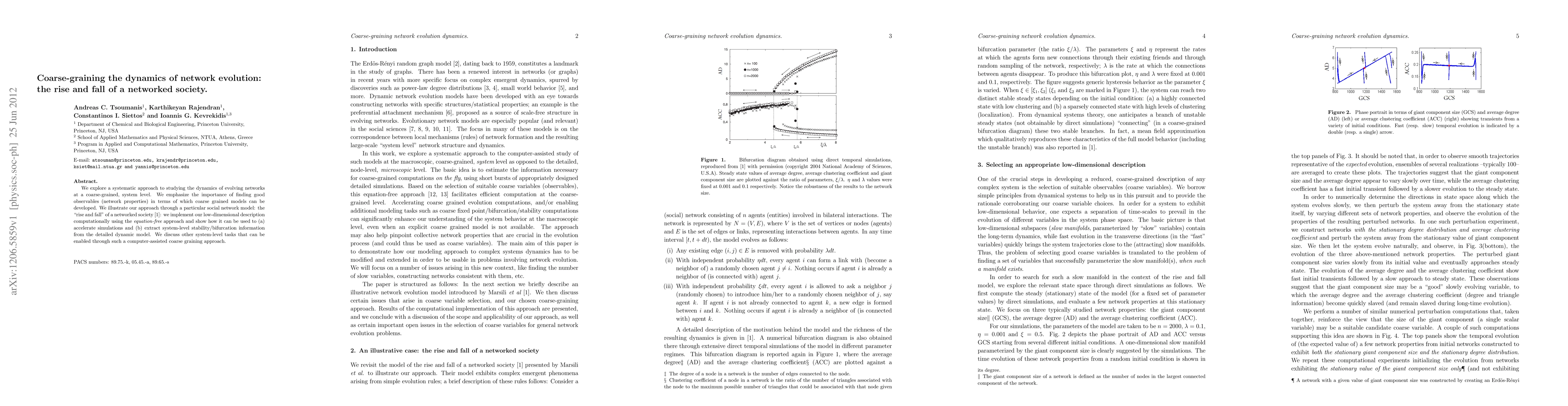 We explore a systematic approach to studying the dynamics of evolving networks at a coarse-grained, system level. We emphasize the importance of finding good observables (network properties) in terms of which coarse grained models can be developed. We illustrate our approach through a particular social network model: the "rise and fall" of a networked society [1]: we implement our low-dimensional description computationally using the equation-free approach and show how it can be used to (a) accelerate simulations and (b) extract system-level stability/bifurcation information from the detailed dynamic model. We discuss other system-level tasks that can be enabled through such a computer-assisted coarse graining approach.