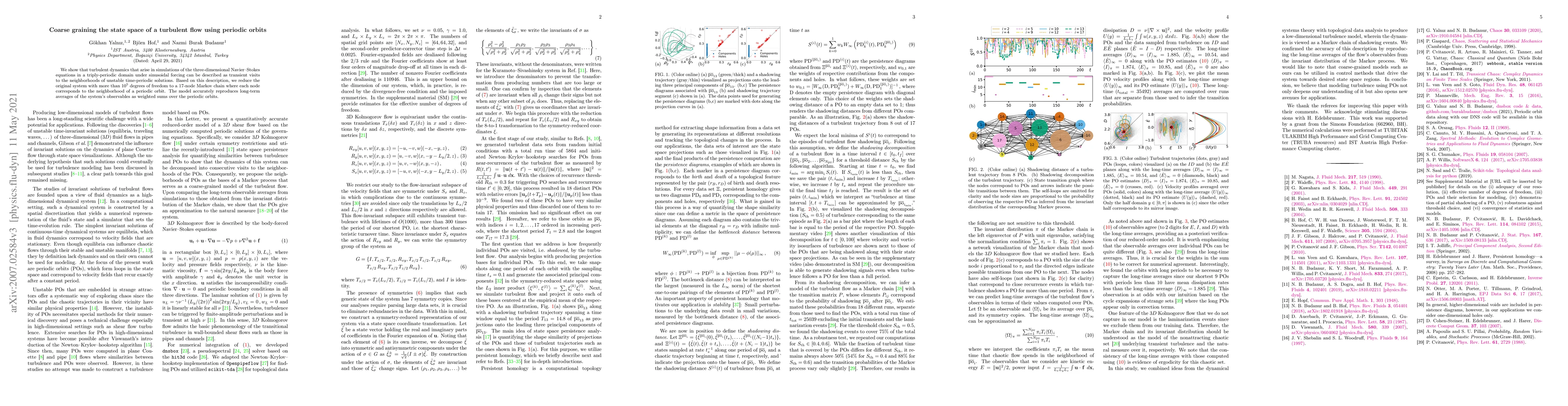 We show that turbulent dynamics that arise in simulations of the three-dimensional Navier--Stokes equations in a triply-periodic domain under sinusoidal forcing can be described as transient visits to the neighborhoods of unstable time-periodic solutions. Based on this description, we reduce the original system with more than $10^5$ degrees of freedom to a 17-node Markov chain where each node corresponds to the neighborhood of a periodic orbit. The model accurately reproduces long-term averages of the system's observables as weighted sums over the periodic orbits.